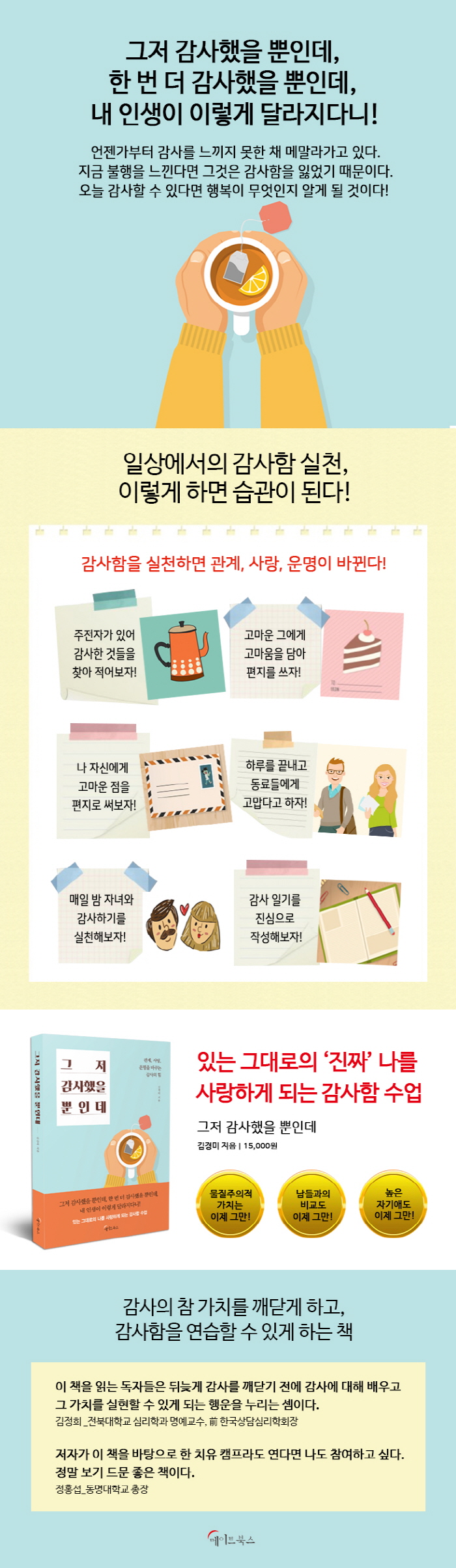 2018 ÇöÀç µ¿¸í´ëÇб³ »ó´ã½É¸®Çаú ±³¼ö·Î ÀçÁ÷ÁßÀ̸ç, ÁÖµÈ ¿¬±¸ °ü½É»ç´Â Çູ, °¨»ç, ·¹Áú¸®¾ð½º µîÀÌ´Ù. ÀüºÏ´ëÇб³ ½É¸®Çаú¸¦ Á¹¾÷ÇÏ°í µ¿ ´ëÇпø¿¡¼ ¼®»ç¡¤¹Ú»çÇÐÀ§¸¦ ¹Þ¾Ò´Ù. ÀÌÈÄ ¼¿ï´ëÇб³ Çູ¿¬±¸¼¾ÅÍ¿¡¼ ¿¬±¸¿øÀ¸·Î Ȱµ¿Çß´Ù. Çѱ¹»ó´ã½É¸®ÇÐȸÀÇ »ó´ã½É¸®Àü¹®°¡ 1±ÞÀ̸ç, ´ëÇб³ ¹× ¾Æµ¿»ó´ã¼¾ÅÍ¿¡¼ »ó´ã, ³îÀÌÄ¡·á, ¸ð·¡ ³îÀÌÄ¡·á, Áý´Ü»ó´ã µîÀ» ½Ç½ÃÇß´Ù. ÀÌ Ã¥Àº °¨»ç¿¡ °üÇÑ ÁúÀû¿¬±¸ ¹× ¾çÀû¿¬±¸¸¦ ÅëÇØ ¹àÇô³½ °¨»çÀÇ °úÁ¤, °¨»çÀÇ À¯ÀÍ, °¨»ç ½Çõ¹æ¾È µîÀ» Ç®¾î¾´ Çູ ¾È³»¼´Ù. ÀÌ Ã¥¿¡¼´Â ¾î¶»°Ô °¨»ç°¡ ÀÌ·ç¾îÁö¸ç, °¨»ç¸¦ Çϸé ÁÁÀº Á¡°ú °¨»çÀÇ ½À°üÀ» ¹æÇØÇÏ´Â ¿ä¼Òµé, ´õ °¨»çÇϱâ À§ÇÑ ³ë·Â µîÀ» ´Ù·ç¾ú´Ù.