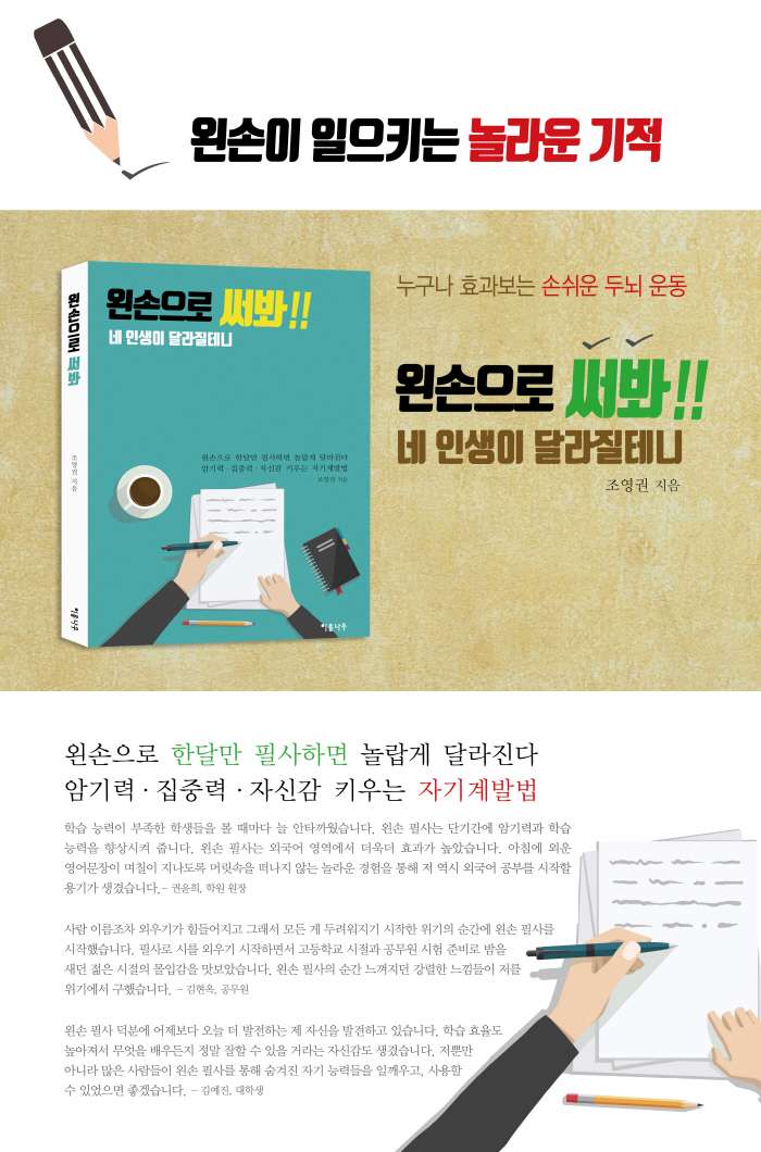 ½ÇÁ¦·Î ¿Þ¼Õ Çʻ縦 ²ÙÁØÈ÷ ÇÑ »ç¶÷µéÀº Á¤¼Àû ¾ÈÁ¤°¨À» ã°í Ȱ±â ³ÑÄ¡´Â »ýȰ ŵµ¸¦ º¸¿©ÁÝ´Ï´Ù. ¸¹Àº »ç¶÷ÀÌ ¿Þ¼Õ ÇÊ»ç·Î ÀÚ½ÅÀÌ °¡Áø ³î¶ó¿î ´É·ÂÀ» ±ú´Ý°í ÀڽۨÀ» °¡Áö°Ô µÇ¾úÀ¸¸ç ±× °á°ú ÀÏ»ó»ýȰ°ú Çо÷, ÀÚ½ÅÀÇ Á÷Àå ¾÷¹«¿¡¼µµ ±àÁ¤ÀûÀÎ º¯ÈµéÀÌ ³ªÅ¸³µ½À´Ï´Ù. ¿Þ¼Õ Çʻ簡 ¾ÈƼ¿¡ÀÌ¡ ±Û¾²±â¸¦ À§ÇÑ °¡Àå ÇÙ½ÉÀûÀÎ ÀÚ¿øÀ» Á¦°øÇÏ´Â ¼ÀÀÔ´Ï´Ù. ---P.212