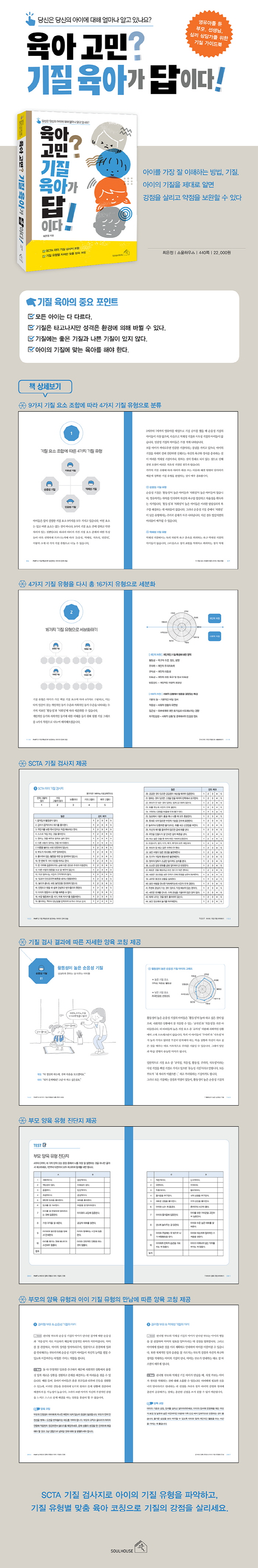 <À°¾Æ °í¹Î? ±âÁú À°¾Æ°¡ ´äÀÌ´Ù!>´Â ºÎ¸ð¿Í ±³»ç, Àü¹®°¡µéÀÌ Á÷Á¢ ±âÁú Áø´Ü°ú ºÐ¼®, ÄÚαîÁö ÇÒ ¼ö ÀÖ´Â ±âÁú¿¡ ´ëÇÑ Á¾ÇÕ ¾È³»¼ÀÔ´Ï´Ù. ¿ì¼± ±âÁúÀ» ÀÌ·ç´Â ¿ä¼Ò 9°¡Áö¸¦ ¸íÈ®È÷ Á¤ÀÇÇϰí, ¼ö¸¹Àº Ä¡·á¿Í ±³À°Àû ÀÓ»óÀ» ÅëÇØ ½×Àº µ¥ÀÌÅ͸¦ ¹ÙÅÁÀ¸·Î ÇÏ¿© ±âÁú À¯ÇüÀ» ºÐ·ùÇÏ°í »ç·Ê¸¦ °çµé¿© ¼³¸íÇÕ´Ï´Ù. µ¶ÀÚ°¡ Á÷Á¢ ¾ÆÀ̵éÀÇ ±âÁúÀ» Á¤È®ÇÏ°Ô Áø´ÜÇÒ ¼ö ÀÖµµ·Ï ÀúÀÚÀÇ ¿¬±¸¼Ò¿¡¼ Á÷Á¢ °³¹ßÇϰí ÀÎÁõ¹ÞÀº SCTA ±âÁú °Ë»ç Áø´ÜÁö¸¦ Ã¥¿¡ ½Ç¾ú°í, Áø´Ü °Ë»ç °á°ú¿¡ µû¶ó ±âÁúÀ» ºÐ¼®ÇÒ ¼ö ÀÖ´Â ¹æ¹ý°ú °¢°¢ÀÇ À¯Çü¿¡°Ô °¡Àå È¿°úÀûÀÎ À°¾Æ¹ýÀ» °¡¸£ÃÄÁÝ´Ï´Ù. ±×µ¿¾È ¾ÆÀ̰¡ ¾î¶² ±âÁúÀÎÁö, ¾î¶»°Ô ÇØ¾ß ¾ÆÀÌ¿¡°Ô ÀûÇÕÇÑ ¹æ¹ýÀ¸·Î À°¾Æ¸¦ ÇÒ ¼ö ÀÖ´ÂÁö °í¹ÎÇØ ¿À¼Ì´ø ºÐÀ̶ó¸é, ÀÌ Ã¥À» ÅëÇØ »õ·Î¿î À°¾ÆÀÇ ÆÐ·¯´ÙÀÓÀ» ¸¸µé¾î°¥ ¼ö ÀÖÀ» °ÍÀÔ´Ï´Ù.