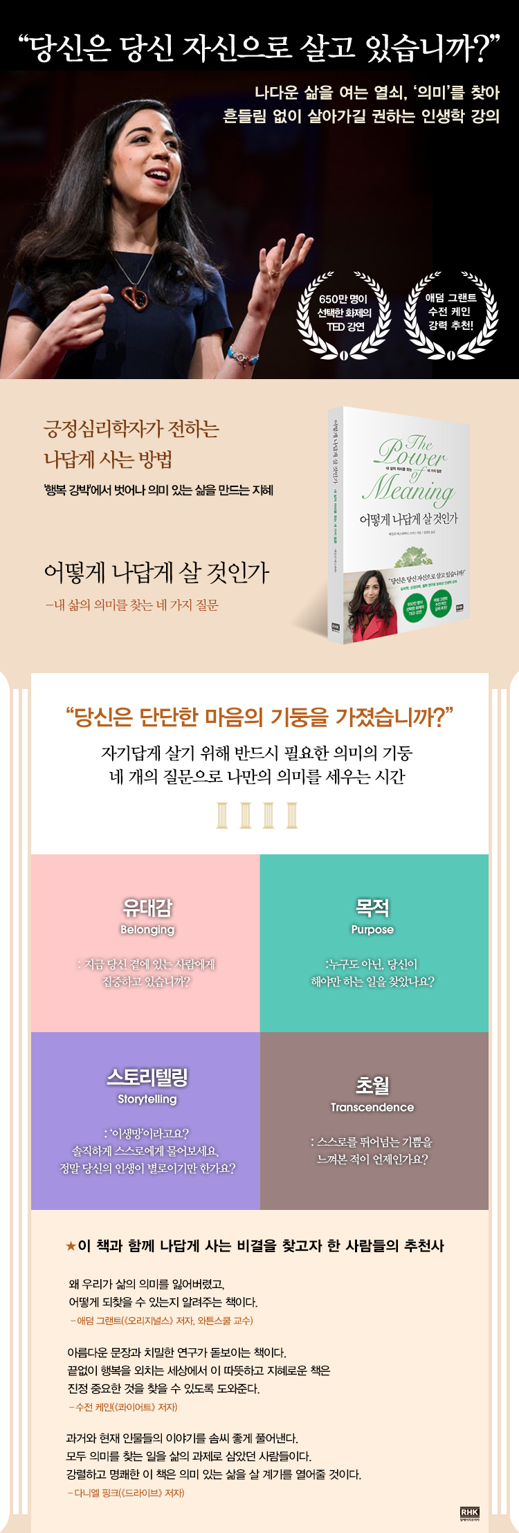 ´Ù¸¥ »ç¶÷µé°ú ±àÁ¤ÀûÀÎ ¹æ½ÄÀ¸·Î °ü°è¸¦ ¸Î°í À¯´ë°¨À» ´À³¢´Â °Í, ½Ã°£À» ½ñÀ» °¡Ä¡°¡ ÀÖ´Â ÀÏÀ» ã´Â °Í, ÀڽŰú ¼¼»óÀ» ÀÌÇØÇÏ´Â µ¥ µµ¿òÀ» ÁÖ´Â À̾߱⸦ ¸¸µå´Â °Í, Àڱ⠻ó½Ç (self-loss)À̶ó´Â ½Åºñ·Î¿î °æÇèÀ» ÇØº¸´Â °Í. ÀÌ ³× °¡Áö ÁÖÁ¦´Â, ÀÇ¹Ì ÀÖ´Â »îÀ» »ì°í ¿©ÀüÈ÷ Àǹ̸¦ ã°í ÀÖ´Â »ç¶÷µé°ú ³ª´« ´ëÈ¿¡¼ °è¼Ó µîÀåÇß´Ù. ÀÌ ÁÖÁ¦µéÀº ¸Ó¸®¸»¿¡¼ ¾Æ¸®½ºÅäÅÚ·¹½º¿Í ½É¸®ÇÐÀÚµéÀÌ Á¦½ÃÇÑ ÀÇ¹Ì ÀÖ´Â »îÀÇ Á¤ÀÇ¿¡µµ ¾ð±ÞµÈ´Ù. ±×µéÀº ¿ì¸®¿Í ŸÀÎÀÇ °ü°è, »çȸ¿¡ ±â¿©ÇϰíÀÚ ÇÏ´Â »ç¸í°¨, À̾߱⸦ ÅëÇØ ÀڽŰú ÀÚ½ÅÀÇ °æÇèÀ» ÀÌÇØÇÏ´Â °Í, ³ª Àڽź¸´Ù ´õ Å« ¹«¾ð°¡¿Í ¸Î´Â °ü°è¿¡¼ Àǹ̰¡ »ý±ä´Ù°í Àú¸¶´ÙÀÇ ¹æ½ÄÀ¸·Î ÁÖÀåÇß´Ù. ³ª ¿ª½Ã ÃÖ±Ù ÁøÇàÇÑ ¿¬±¸¿¡¼ ÀÇ¹Ì ÀÖ´Â »î°ú ÀÇ¹Ì ÀÖ°Ô »ç´Â ¹æ¹ýÀ» Á¶»çÇÏ¸é¼ ±× »ç½ÇÀ» ±ú´Þ¾Ò´Ù. ¶Ç öÇм, ¹®Çм, Á¾±³ ¼Àû°ú ºÒ±³ °æÀü, ¹Ì±¹ÀÇ ¼±ÇèöÇÐ, ¼Ò¼³, ¿µÈ µî ´ëÁß¹®È¿¡¼µµ ¹ß°ßÇß´Ù. ³× °¡Áö ÁÖÁ¦, Áï À¯´ë°¨, ¸ñÀû, ½ºÅ丮ÅÚ¸µ, ÃÊ¿ùÀº Àǹ̸¦ ¹ÞÄ¡´Â ³× °³ÀÇ ±âµÕÀ̾ú´Ù.