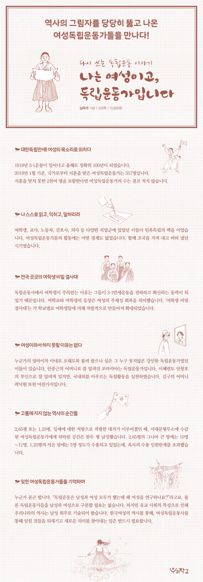 ÃÖÃÊ ¿©¼ºÀǺ´Àå¿¡¼ ±¹³»¿Ü ¿©¼ºµ¶¸³¿îµ¿°¡¿¡ À̸£±â±îÁö ±×ºÐµéÀÇ ±â¾ïÀ» ã¾Æ ³ª°¡°í ÀÖ½À ´Ï´Ù. Èñ¸ÁÀÇ ºûÀ» ÀÒÁö ¾Ê°í, °ÀÎÇÏ°í ¿ë°¨Çß´ø ¿ª»ç ¼Ó ¿©¼ºµéÀ» ±â¾ïÇÏ°í ½Í½À´Ï´Ù. ±×µ¿¾È ¾´ Ã¥ À¸·Î ¡º¿©¼ºµ¶¸³¿îµ¿°¡ÀÇ ¹ßÀÚÃ븦 ¾Ë¸®´Ù¡»¡ºÀι®ÇРƯ°¡»(°øÀú) ¡ºÅëÀÏÀÇ ±æ, Çѱ¹¿©¼º µ¶¸³¿î µ¿¿¡¼ ã´Ù¡»¡º´ç½ÅÀÌ ¾Ë¾Æ¾ß ÇÒ Çѱ¹»ç 10-Àι°Æí¡» µîÀÌ ÀÖ½À´Ï´Ù.