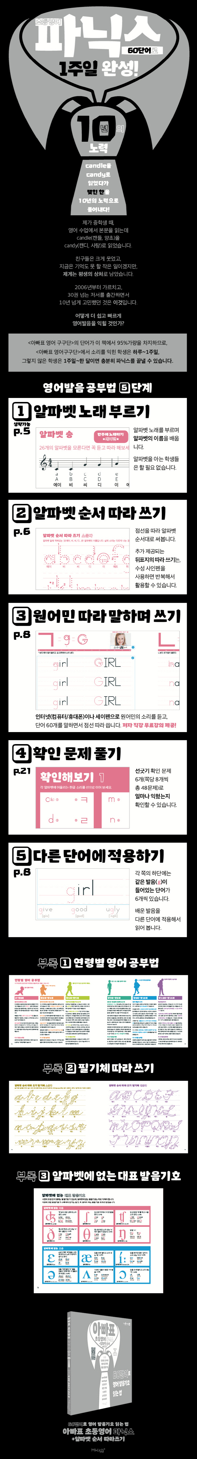 ¿µ¾î´Â ÀûÇô Áø´ë·Î ¼Ò¸® ³ªÁö ¾Ê´Â´Ù. ±×·¡¼ »çÀüÀ» ã¾Æº¸Áö¸¸ ¼Ò¸®´Â ¡®¹ßÀ½±âÈ£¡¯·Î ÀûÇô ÀÖ¾î¼, °á±¹ ¡®¹ßÀ½±âÈ£¡¯¸¦ ¶Ç ¹è¿ö¾ß ÇÑ´Ù. ¾ËÆÄºª, ¿µ¾î¹ßÀ½°ú ¹ßÀ½±âÈ£¸¦ ´õ ½±°Ô ÀÍÈ÷´Â ¹æ¹ýÀ» 10³â°£ ã¾Ò´Ù. ±× °á°ú ¡®¾ÆºüÇ¥ Ãʵ¾î ÆÄ´Ð½º¡¯´Â ´Ü 60´Ü¾î¸¦ ¾²¸é¼ ¿ø¾î¹Î À½¼ºÀ» µû¶ó ¸»Çϸé, ¾ËÆÄºª°ú ÆÄ´Ð½º, ¹ßÀ½±âÈ£¸¦ µ¿½Ã¿¡ ÀÍÈú ¼ö ÀÖ´Ù. ÃʵîÇлý°ú À¯Ä¡¿ø ¾î¸°À̵µ ª°Ô´Â ÇÏ·ç, ±æ°Ô´Â ÇÑ ´Þ ¸¸¿¡ ¿µ¾î¸¦ ÀÐ°í ¾µ ¼ö ÀÖ´Ù. ¹«·á°ÀÇ Æ÷ÇÔ.