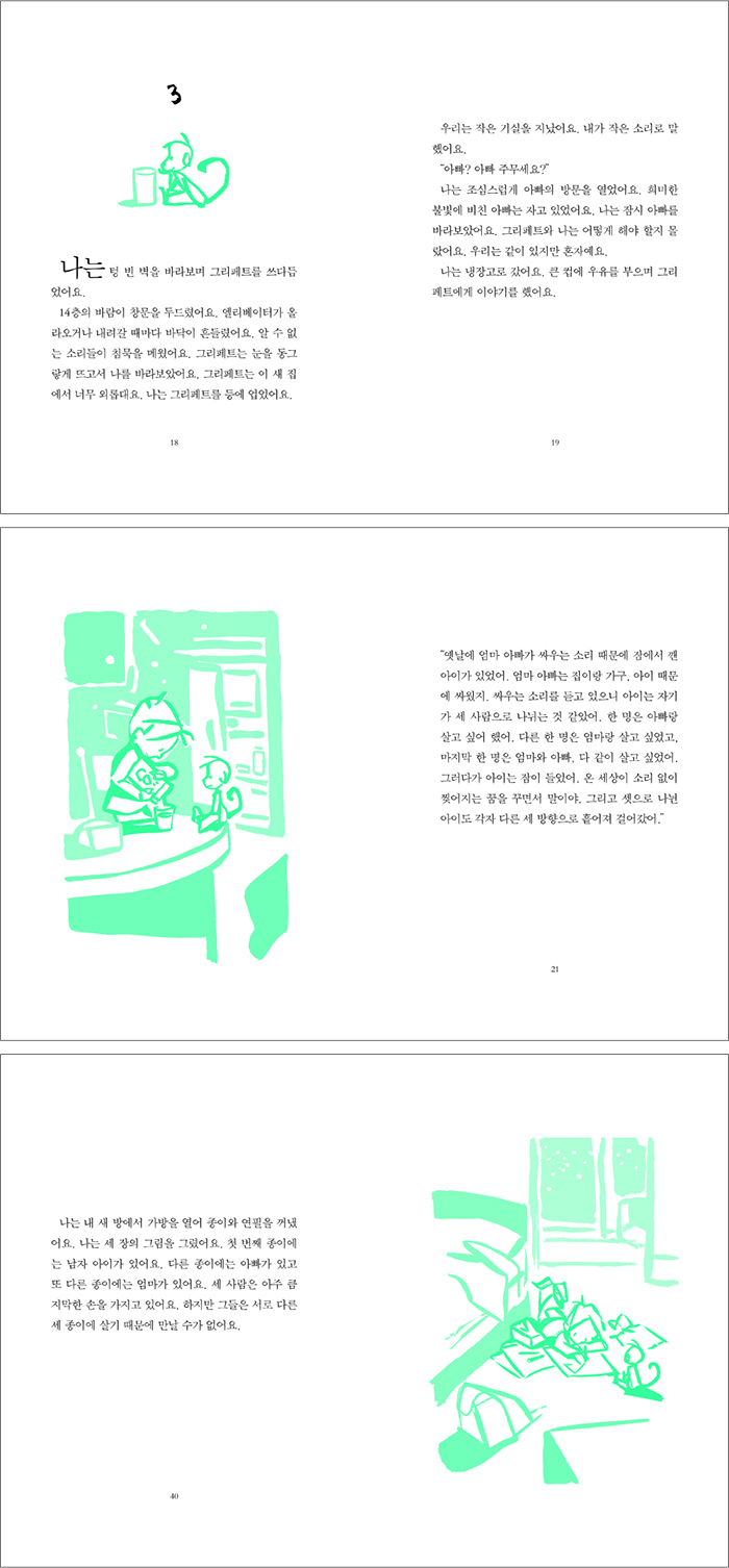 ¡°¿¾³¯¿¡ ¾ö¸¶ ¾Æºü°¡ ½Î¿ì´Â ¼Ò¸® ¶§¹®¿¡ Àá¿¡¼ ±ü ¾ÆÀ̰¡ ÀÖ¾ú¾î. ¾ö¸¶ ¾Æºü´Â ÁýÀ̶û °¡±¸, ¾ÆÀÌ ¶§¹®¿¡ ½Î¿üÁö. ½Î¿ì´Â ¼Ò¸®¸¦ µè°í ÀÖÀ¸´Ï ¾ÆÀÌ´Â ÀڱⰡ ¼¼ »ç¶÷À¸·Î ³ª´µ´Â °Í °°¾Ò¾î. ÇÑ ¸íÀº ¾Æºü¶û »ì°í ½Í¾î Çß¾î. ´Ù¸¥ ÇÑ ¸íÀº ¾ö¸¶¶û »ì°í ½Í¾ú°í, ¸¶Áö¸· ÇÑ ¸íÀº ¾ö¸¶¿Í ¾Æºü, ´Ù °°ÀÌ »ì°í ½Í¾ú¾î. ±×·¯´Ù°¡ ¾ÆÀÌ´Â ÀáÀÌ µé¾ú¾î. ¿Â ¼¼»óÀÌ ¼Ò¸® ¾øÀÌ Âõ¾îÁö´Â ²ÞÀ» ²Ù¸é¼ ¸»À̾ß. ±×¸®°í ¼ÂÀ¸·Î ³ª´¶ ¾ÆÀ̵µ °¢ÀÚ ´Ù¸¥ ¼¼ ¹æÇâÀ¸·Î Èð¾îÁ® °É¾î°¬¾î.¡±