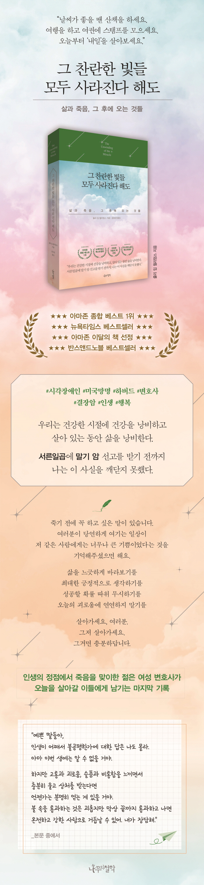 ¡¶±× Âù¶õÇÑ ºûµé ¸ðµÎ »ç¶óÁø´Ù ÇØµµ¡·´Â ¼ö¸¹Àº ½Ã·Ã¿¡µµ ºÒ±¸ÇÏ°í ¿Á¤ÀûÀ̰í Ȱ±âÂ÷°Ô »ì¾Æ°¡´ø ÇÑ ¿©¼ºÀÌ, ½ÃÇѺΠ¼±°í¸¦ ¹Þ°í 5³â°£ Åõº´ »ýȰÀ» ÇÏ¸é¼ ³²±ä ±â·ÏÀÌ´Ù. ÇÏ·ç¶óµµ ´õ »ì±â À§ÇØ ¸öºÎ¸²Ä¡´Â ´ë½Å »ì¾Æ ÀÖ´Â µ¿¾È ÀλýÀ» Áñ±â°í, ³²°ÜÁø µÎ µþ¿¡°Ô ÀÇ¹Ì ÀÖ´Â ¸Þ½ÃÁö¸¦ ÀüÇϱâ À§ÇØ ÀÌ Ã¥À» ½è´Ù. °¡Á·À» ÇâÇÑ »ç¶û, ¼º°ø¿¡ ´ëÇÑ ¾ß¸Á, ½Ã°¢Àå¾ÖÀÎÀ¸·Î »ì¸é¼ ´À²¼´ø ¼ö¸¹Àº ¹æÈ²°ú ºÐ³ë, ¾Ï¿¡ ´ëÇÑ °øÆ÷¿Í È¥¶õ µîÀ» ¼û±è ¾øÀÌ ½á³»·Á°£ ÀÌ Ã¥Àº Ãâ°£ Á÷ÈÄ ¹Ì±¹ ¾Æ¸¶Á¸ º£½ºÆ®¼¿·¯¿¡ ¿À¸£¸ç ¼ö¸¹Àº µ¶ÀÚµéÀÇ Âù»ç¸¦ ¹Þ¾Ò´Ù.