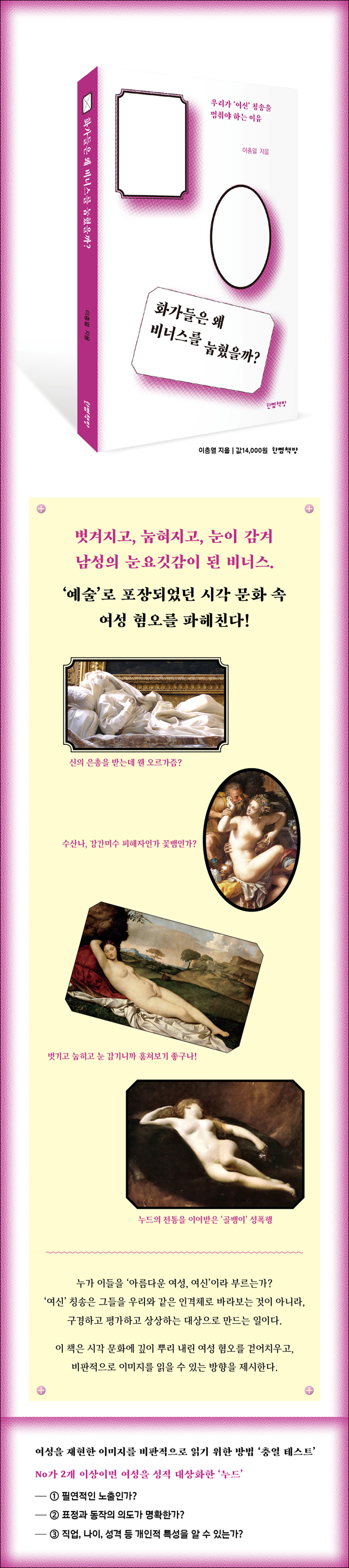 P. 114 ±×¸² ¼Ó ¿©¼ºÀº ¹þÀº ÀÚ½ÅÀÇ ¸öÀ» Æí¾ÈÇϰÔ, ÃæºÐÈ÷ °¨»óÇÒ ¼ö ÀÖµµ·Ï ´«À» °¨½À´Ï´Ù. ½Ã¼±ÀÇ ÁÖü°¡ µÇ¾î¼´Â ¾È µÇ±â ¶§¹®ÀÌÁö¿ä. ±×¸®°í ¸ö¿¡´Â °Üµå¶ûÀÌ Åеµ À½¸ðµµ ¾ø½À´Ï´Ù. ¸ö¿¡ ³ ÅÐÀº ³²¼º¼ºÀ» ¶°¿Ã¸®°Ô ÇϹǷΠÁ¦°ÅÇØ¾ß ÇÏ´Â °ÍÀÔ´Ï´Ù. Á¡À̳ª ÈäÅÍ, ÁÖ¸§µµ ÀüÇô ¾øÀÌ ¸Å²öÇÏ°í µû¶æÇÏ¸ç ºÎµå·´°Ô Ç¥ÇöµÈ ÇǺδ Ã˰¢À» ÀÚ±ØÇÏÁö¿ä. ¼ÕÀ» »¸À¸¸é ¸¸Áú ¼ö ÀÖÀ» °Í °°Àº, ¼öµ¿ÀûÀÎ Á¸Àç·Î º¸ÀÌ´Â ¿©¼ºÀ̾߸»·Î ¡®¹ÌÀÇ ±âÁØ¡¯ÀÌ µÇ¾ú½À´Ï´Ù.
