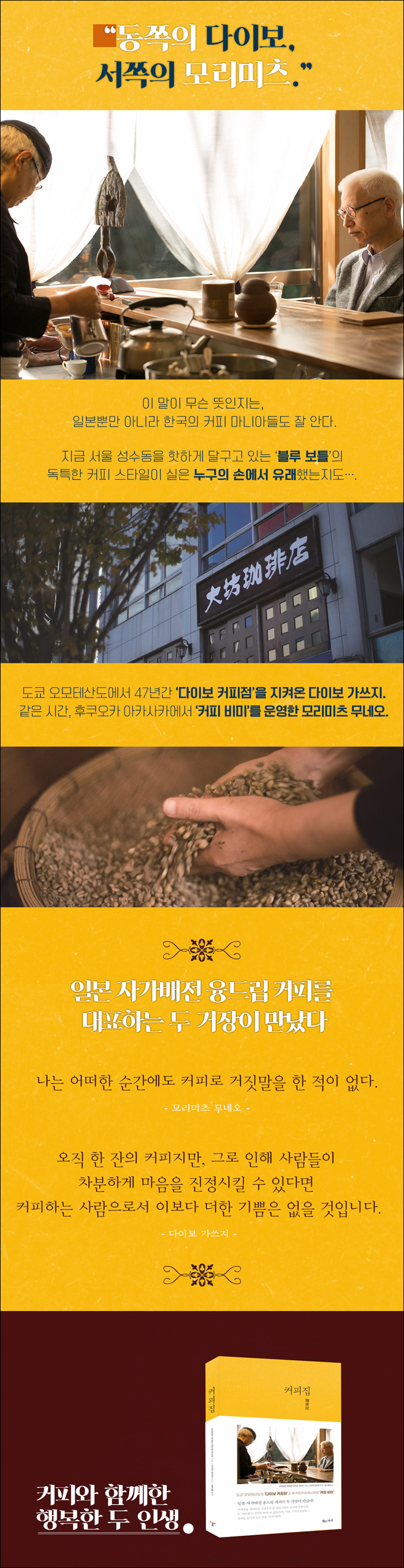 Ã¥ Á¦¸ñ ¡¶Ä¿ÇÇÁý¡·Àº »ýµÎ ¹èÀüºÎÅÍ ÃßÃâ, ³ª¾Æ°¡ ÇÑ ÀÜÀÇ Ä¿ÇǸ¦ ¿À°¨À¸·Î ´À³¢°Ô ÇÏ´Â Ä¿ÇǼó ¿î¿µ±îÁö, ¿ø·ù¿¡¼ ÇÏ·ù±îÁö ÀÚ½ÅÀÇ Ã¥ÀÓÀ» ´ÙÇϸç Ä¿ÇǸ¦ ¾÷À¸·Î ÇÏ´Â »ç¶÷ ÀÚü¿Í ±×°¡ ¿î¿µÇÏ´Â Àå¼Ò¸¦ µÎ·ç ÀÏÄ´´Ù. µÎ ¸íÀÇ ¡®Ä¿ÇÇÁý¡¯Àº ¹«¾ùÀ» »ý°¢Çϰí, ¾î¶°ÇÑ ±æÀ» °É¾î¿Ô´Â°¡? ÀÌ ´ë´ãÁýÀ» ÅëÇØ ¿ì¸®°¡ »ç¶ûÇß´ø µÎ Ä¿ÇÇÁýÀÇ ¸»°ú »ý°¢, ŵµ, °¡°Ô¿¡ È帣´Â °ø±â¿¡ À̸£±â±îÁö ¾Æ¸§´Ù¿î ¼¼°è¸¦ ¸¹Àº ºÐµéÀÌ Ã¼ÇèÇÏ½Ç ¼ö ÀÖ´Ù¸é ´õ¾øÀÌ ±â»Ü °Í °°´Ù.