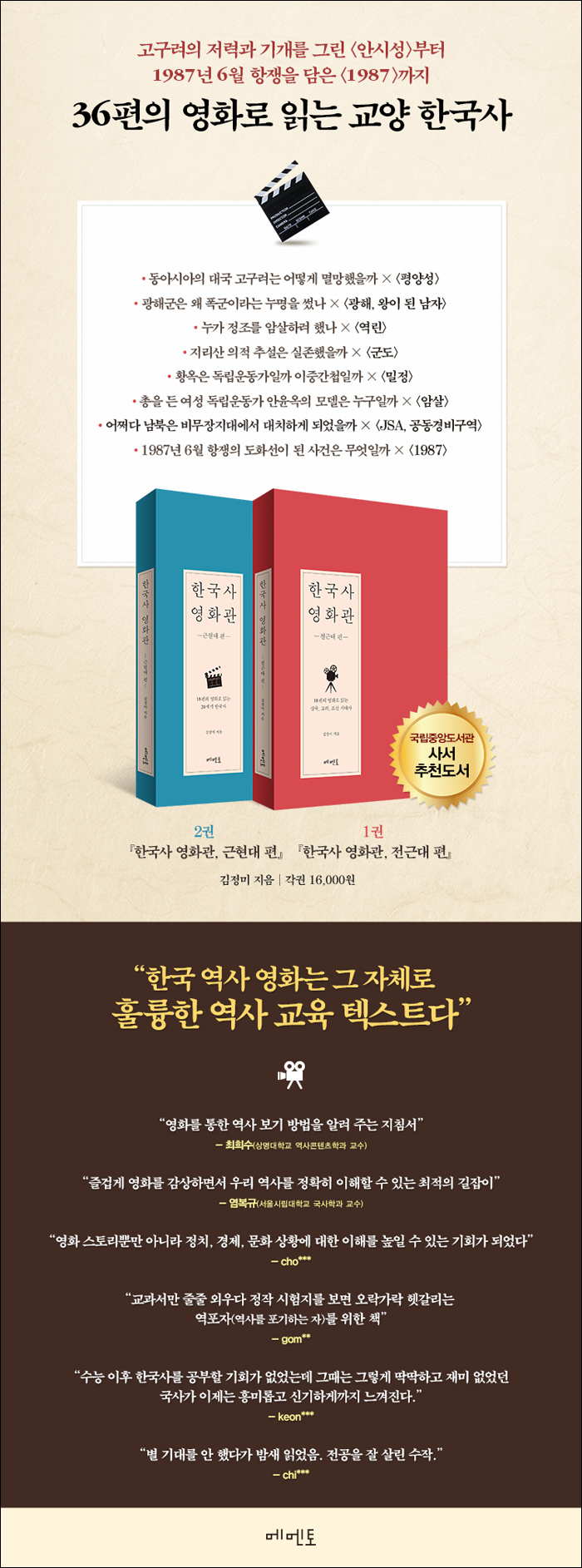 ¡°ÀÌ Ã¥Àº °ü°´µéÀÌ ¿µÈÀÇ Àç¹Ì»Ó ¾Æ´Ï¶ó ¿ª»ç¿¡ ´ëÇÑ Èï¹Ì±îÁö ÇÔ²² ´À³¢±â¸¦ ¹Ù¶ó´Â ¸¶À½¿¡¼ ¾²¿´´Ù. Àü°øÀÚÀ̰ųª ¿ª»ç¿¡ ´ëÇØ Áö´ëÇÑ °ü½ÉÀ» °¡Áø »ç¶÷ÀÌ ¾Æ´Ï¶ó¸é ¸ðµç ¿ª»ç ¿µÈÀÇ ½Ã´ë»óÀ» Àß ¾Ë±â´Â ¹«Ã´ ¾î·Æ´Ù. ±×·¯³ª ¿ª»ç ¿µÈ¸¦ º¼ ¶§ ¿µÈ°¡ ´Ù·ç´Â ½Ã´ë ¹è°æÀ̳ª Àι°À» ¾Ë¸é ¿µÈ º¸´Â Àç¹Ì°¡ ¹è°¡µÇ´Â °ÍÀº ºÐ¸íÇÏ´Ù. ¡ºÇѱ¹»ç ¿µÈ°ü¡»À» Ãâ°£ÇÑ ÈÄ ´Ù¾çÇÑ ´ëÁß °¿¬À» ´Ù´Ï¸é¼ °ü°´ÀÌÀÚ µ¶ÀÚ¸¦ ¸¹ÀÌ ¸¸³µ´Ù. ¿µÈ¸¦ º¼ ¶§ Àß ¸ô¶ú´ø ¿ª»çÀû »ç½ÇÀ» ¾Ë°í ³ªÀÚ ¿µÈ°¡ ´õ Àç¹ÌÀÖ¾îÁ³°í, ¿ª»ç¸¦ ´õ °øºÎÇÏ°í ½Í±âµµ ÇÏ°í ¿µÈ¿Í ´Ù¸¥ °üÁ¡À¸·Î ´ç´ë¸¦ »ý°¢ÇØ º¼ ¿©Áö°¡ »ý°å´Ù´Â ºÐµéÀÌ ¸¹¾Ò´Ù. À̰ÍÀÌ ´õ ¸¹Àº ¿µÈ¸¦ ´Ù·ç¸é¼ ¡ºÇѱ¹»ç ¿µÈ°ü¡»À» µÎ ±ÇÀ¸·Î °³Á¤?Áõº¸ÇÏ°Ô µÈ °è±â°¡ µÇ¾ú´Ù.¡±