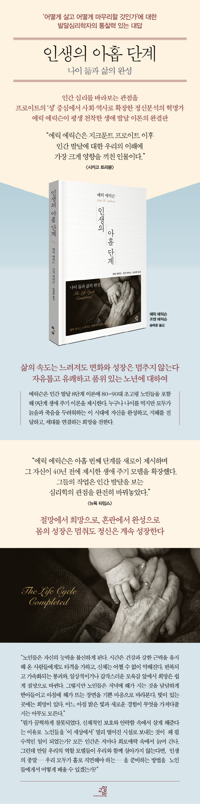 ÀúÀÚ : ¿¡¸¯ ¿¡¸¯½¼ (Erik H. Erikson, 1902~1994) µ¶ÀÏ Ãâ½Å ¹Ì±¹ ½É¸®ÇÐÀÚ, Á¤½ÅºÐ¼®°¡. Àΰ£ ¹ß´Þ À̷аú Á¤Ã¼¼º À§±â °³³äÀ» Á¤¸³Çß´Ù. »ýºÎ°¡ ´©±¸ÀÎÁö ¸ð¸¥ ä µ§¸¶Å© Ãâ½Å À¯´ëÀÎ ¾î¸Ó´Ï¿Í µ¶ÀÏ Ãâ½Å À¯´ëÀÎ »õ¾Æ¹öÁö ¹Ø¿¡¼ ÀÚ¶ú´Ù. ±×·¯³ª À¯´ëÀΰú ´Ù¸¥ ¿Ü¸ð ¶§¹®¿¡ ¾î¸° ½ÃÀýºÎÅÍ ÀÚ½ÅÀÇ Á¤Ã¼¼ºÀ» µÎ°í ±íÀÌ °í¹ÎÇß´Ù. ±è³ªÁö¿òÀ» Á¹¾÷ÇÏ°í ¿¹¼ú°¡¸¦ ²Þ²Ù¸ç À¯·´ °¢Áö¸¦ ¶°µ¹´Ù 1927³âºÎÅÍ 6³â°£ ºóÀÇ Á¤½ÅºÐ¼®¿¬±¸¼Ò¿¡¼ ¾È³ª ÇÁ·ÎÀÌÆ®¿¡°Ô Á¤½ÅºÐ¼® ÈÆ·ÃÀ» ¹Þ¾Ò´Ù. ³ªÄ¡ÀÇ ¾ï¾ÐÀ» ÇÇÇØ 1933³â ¹Ì±¹À¸·Î °Ç³Ê°£ ¿¡¸¯½¼Àº ÇÐÀ§µµ ¾ø°í Á¤½Ä ÀÇÇÐ °øºÎµµ ÇÑ ÀûÀÌ ¾ø¾úÀ¸³ª ÇϹöµå Àǰú´ëÇп¡¼ ¹Ì±¹ ÃÖÃÊÀÇ ¾Æµ¿ Á¤½ÅºÐ¼®°¡·Î Ȱµ¿À» ½ÃÀÛÇß´Ù. ÀÌÈÄ Ä¶¸®Æ÷´Ï¾Æ´ëÇÐ(UC¹öŬ¸®), ¿¹ÀÏ´ëÇÐÀ» °ÅÃÄ 1960³âºÎÅÍ ÇϹöµå´ëÇп¡¼ ±³¼ö·Î ÀçÁ÷Çß´Ù. ¿¡¸¯½¼ÀÇ ½É¸® ÀÌ·ÐÀº 20¼¼±â Á¤½ÅºÐ¼®À» ³Ñ¾î ¿ª»çÇÐ, Á¤Ä¡ÇÐ, Á¾±³ÇÐ, ÀηùÇÐ, »çȸÇÐ µî ¿©·¯ ºÐ¾ß¿¡ ±¤¹üÀ§ÇÑ ¿µÇâÀ» ³¢ÃÆ´Ù. »ý¾Ö ÁÖ±â ÀÌ·ÐÀ» Àû¿ëÇØ °£µðÀÇ »îÀ» ÃßÀûÇÑ Ã¥ ¡¶°£µðÀÇ Áø¸®¡··Î ǽ¸®Ã³»ó°ú Àü¹Ìµµ¼»óÀ» ¹Þ¾Ò´Ù. Àú¼·Î ¡¶À¯³â±â¿Í »çȸ¡·, ¡¶Ã»³â ·çÅÍ¡·, ¡¶Á¤Ã¼¼º: û³â°ú À§±â¡· µîÀÌ ÀÖ´Ù. ¿ªÀÚ : Á¶¾Ø ¿¡¸¯½¼(Joan M. Erikson, 1903~1997) ij³ª´Ù¿¡¼ ž´Ù. ¿¡¸¯ ¿¡¸¯½¼°ú 1930³â¿¡ °áÈ¥ÇßÀ¸¸ç, ¿¡¸¯½¼ÀÌ Àΰ£ ¹ß´Þ ÀÌ·ÐÀ» Á¤¸³ÇÏ´Â µ¥ Å« µµ¿òÀ» ÁÖ¾ú´Ù. Ä÷³ºñ¾Æ´ëÇп¡¼ ±³À°ÇÐ Çлç, Ææ½Çº£À̴ϾƴëÇп¡¼ »çȸÇÐ ¼®»ç ÇÐÀ§¸¦ ¹Þ¾Ò´Ù. ±³»çÀÌÀÚ ÀÛ°¡·Î Ȱµ¿ÇßÀ¸¸ç ¹ÎÁ·ÁöÇÐÀÚ·Î ÃãÀ» ¿¬±¸Çϱ⵵ Çß´Ù. ¿ªÀÚ : ¼ÛÁ¦ÈÆ ¼¿ï¿¡¼ ž ÇѾç´ëÇб³ ¿µ¾î±³À°Çаú¸¦ Á¹¾÷Çϰí, ÇöÀç ¼¿ï ºÒ¾Ï°íµîÇб³¿¡¼ ÇлýµéÀ» °¡¸£Ä¡°í ÀÖ´Ù. ÇÑ °³ÀÎÀÇ »î°ú Á¤½ÅÀÇ ¼ºÀåÀÌ ±â·ÏµÈ Ã¥À» °ü½É ÀÖ°Ô ÀÐ°í ¿Å±â°í ÀÖÀ¸¸ç, Àΰ£ÀÇ ½É¸®Àû ¹ß´Þ¿¡ ´ëÇÑ ÁÖÁ¦·Î ±× °ü½ÉÀ» ³ÐÈ÷°í ÀÖ´Ù. ¡¶°£µðÀÇ Áø¸®¡·, ¡¶À¯³â±â¿Í »çȸ¡·, ¡¶¾Æ¹öÁöÀÇ ¼Õ¡·, ¡¶·¯¼¿ º£ÀÌÄ¿ ÀÚ¼Àü: ¼ºÀå¡·, ¡¶¸¸¸¸ÇÑ ³ë¾ö ÃνºÅ°¡·, ¡¶¸¸¸¸ÇÑ ÇÏ¿öµå Áø¡· µîÀ» ¹ø¿ªÇß´Ù.