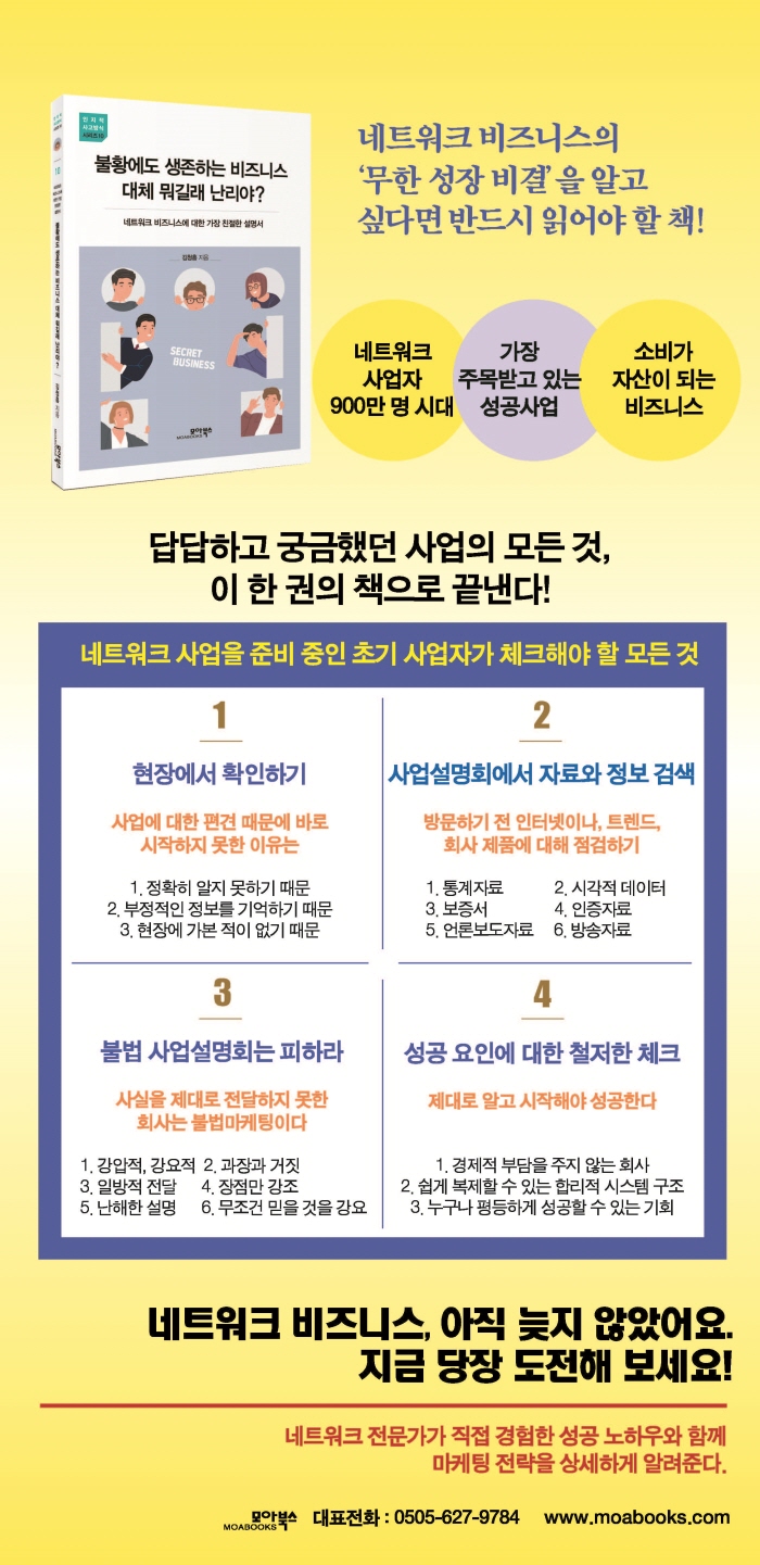 ÇöÀç´Â ³×Æ®¿öÅ© ºñÁî´Ï½º ±³À°°ú °æ¿µÄÁ¼³ÅÏÆ®·Î Ȱµ¿ ÁßÀ̸ç, ¸¹Àº À̵鿡°Ô ¼º°ø ³ëÇϿ츦 °ÀÇÇϰí ÀÖ´Ù. ±×¸®°í »ç¾÷¿¡ ½±°Ô Âü¿©ÇÒ ¼ö ÀÖ´Â °¡À̵带 ÁýÇÊÇÏ¿© 100¸¸ ¸í ÀÌ»óÀÇ µ¶ÀÚ¿¡°Ô Æø¹ßÀûÀΠȣÀÀÀ» ¾òÀº Ã¥ ¡¶³×Æ®¿öÅ© ¸¶ÄÉÅ͸¦ À§ÇÑ Ãʱâ 3°³¿ù ¼º°ø Å×Å©¡·´Â »ç¾÷Àڵ鿡°Ô Çʵ¶¼·Î ¾Ë·ÁÀú ÀÖ´Ù.
