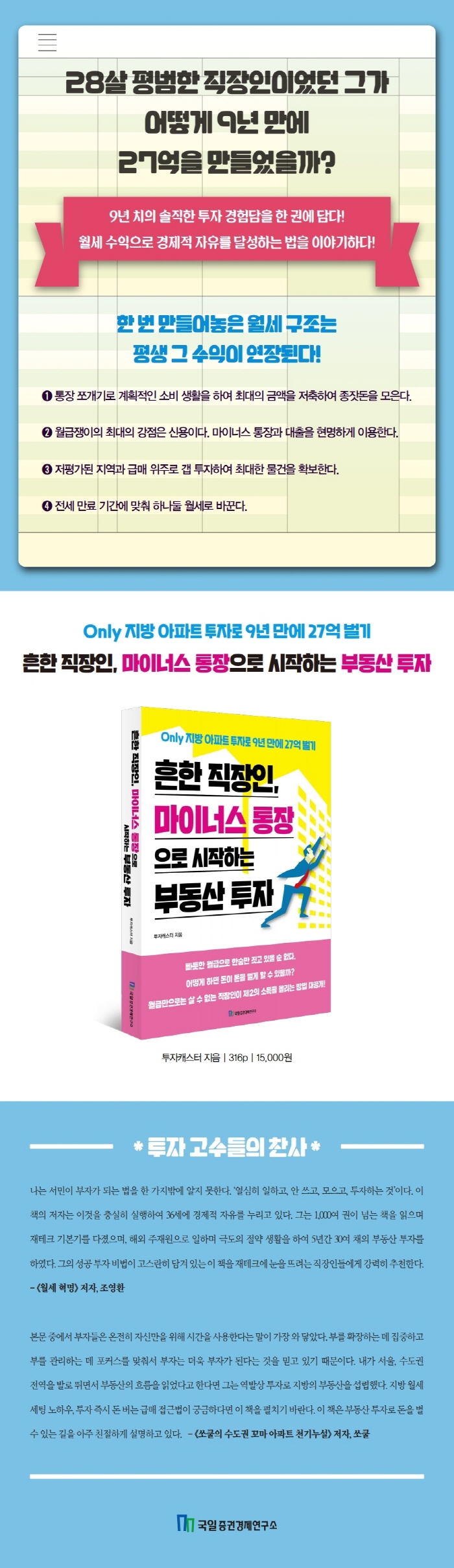 30´ë Æò¹üÇÑ Á÷ÀåÀÎÀÎ ±×´Â 2010³â Ãë¾÷ ÈÄ ÀçÅ×Å©¿¡ °ü½ÉÀ» µÎ±â ½ÃÀÛÇØ¼ ¿ª¹ß»ó ÅõÀÚ·Î 27¾ïÀÇ ÀÚ»êÀ» ´Þ¼ºÇÑ 9³â Â÷ ÅõÀÚÀÚ´Ù. óÀ½¿¡´Â Á÷ÀåÀÎ ´ëÃâÀ» ¹Þ¾Æ¾ß ÇÒ ¸¸Å Á¾Àãµ·À̶ó°í´Â 1¿øµµ ¾ø´Â ¹«ÀÏǬÀ̾ú´Ù. ºÎ¸ð´ÔÀÇ µµ¿òÀ» ±â´ëÇÒ ¼ö ¾ø¾ú´ø ±×´Â ºÎÀÚ°¡ µÇ·Á¸é ÅõÀÚ¸¦ ÇØ¾ß°Ú´Ù°í ¸¶À½¸Ô°í ºÎµ¿»ê ÅõÀÚ¿¡ ´ëÇØ °øºÎÇϱ⠽ÃÀÛÇß´Ù. ÅÙÀÎÅÙ Ä«Æä¿¡ °¡ÀÔÇÏ¸é¼ º»°ÝÀûÀÎ ºÎµ¿»ê °øºÎ¸¦ ½ÃÀÛÇß°í, ÇØ¿Ü ÁÖÀç¿øÀ¸·Î ±Ù¹«ÇÏ¸é¼ ºÎÁ·ÇÑ Áö½ÄÀ» ä¿ì±â À§ÇØ 1,500±ÇÀÇ Ã¥À» ÁýÁßÀûÀ¸·Î Àоú´Ù.