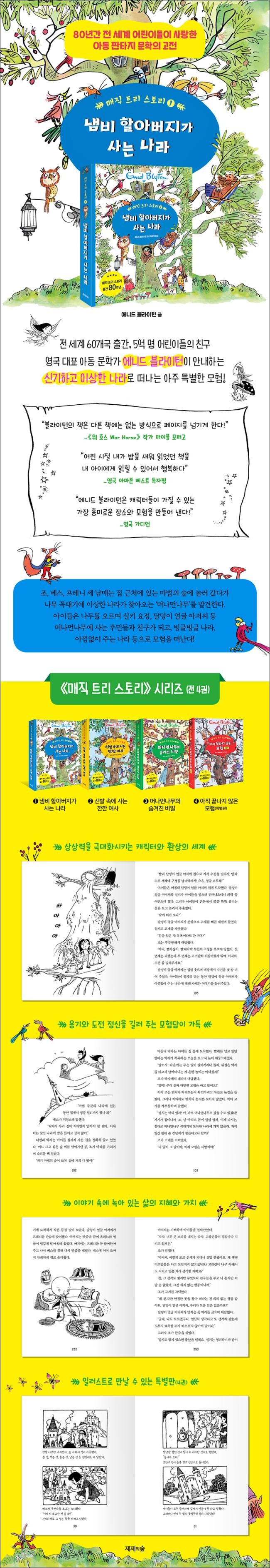 <¸ÅÁ÷ Æ®¸® ½ºÅ丮> ½Ã¸®Áî´Â ÁÖÀΰø Á¶, º£½º, ÇÁ·¹´Ï ¼¼ ³²¸Å°¡ Áý ±Ùó ¸¶¹ýÀÇ ½£¿¡¼ ¹ß°ßÇÑ ¼¼»ó¿¡¼ °¡Àå Ä¿´Ù¶õ ³ª¹«ÀÎ ¸Ó³ª¸Õ³ª¹«¸¦ ÅëÇØ ½Å±âÇϰí ÀÌ»óÇÑ ³ª¶ó·Î Èï¹ÌÁøÁøÇÑ ¸ðÇèÀ» ¶°³ª´Â ÆÇŸÁö µ¿È´Ù. ÀÏ·¯½ºÆ®·Î ¸¸³¯ ¼ö Àִ Ưº°ÆÇÀ» Æ÷ÇÔÇÏ¿© ¸ðµÎ 4±ÇÀ¸·Î ÀÌ·ç¾îÁ® Àִµ¥, ¿È´Ï¹ö½º ÇüÅ·Π±¸¼ºµÇ¾î ÀÖ¾î È£ÈíÀÌ ±ä ±ÛÀ» Àб⠾î·Á¿öÇÏ´Â ¾ÆÀ̵鿡°Ôµµ Á¦°ÝÀÌ´Ù. ´«°ú ¾óÀ½ÀÇ ³ª¶ó, Ãâ··Ãâ·· ³ª¶ó, ¾Æ³¦¾øÀÌ ÁÖ´Â ³ª¶ó, ºÒÈ£·É ¿©»çÀÇ ³ª¶ó, ÇØ°áÃ¥ÀÇ ³ª¶ó, °úÀÚ ³ª¶ó µîµî ¿©·¯ ½Å±âÇÏ°í ³î¶ó¿î ³ª¶ó·Î ¶°³ª¸é¼ °Þ´Â ÁÂÃæ¿ìµ¹ ¸ðÇè´ãÀº ¾ÆÀ̵éÀÇ ¹«ÇÑÇÑ »ó»ó·ÂÀ» ÀÚ±ØÇÏ°í ¼¼»óÀ» º¸´Â ÁöÇý¿Í ¾î·Á¿òÀ» ±Øº¹ÇÒ ¿ë±â¸¦ ÁÙ °ÍÀÌ´Ù.
