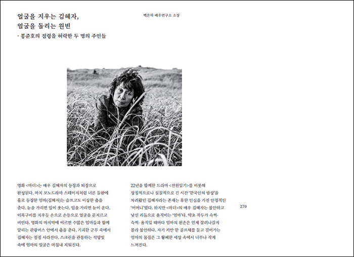 P. 271 ÀÌ ¹è¿ìµéÀÇ ¼ºÃë´Â ¡®ºñ±³ºÒ°¡¡¯°¡ ¾Æ´Ï¶ó ¡®´ëü ºÒ°¡¡¯´Ù. ´«ºÎ½Å ¹Ì¼Ò³â°ú ÀÚ¾Ö·Î¿î ¾î¸Ó´Ï´Â ¿©±â¿¡ ¾ø´Ù. ¿µÈ '¸¶´õ'´Â ±èÇýÀÚ°¡ ¾Æ´Ï¾ú´Ù¸é ¾Æ¿¹ ¸¸µé¾îÁú ¼ö ¾ø´Â ¿µÈÀÌ´Ù. ¡®µµÁØ¡¯Àº ¿øºóÀÌ ¾Æ´Ï¾ú´Ù¸é ¾Æ¿¹ ´Þ¶óÁ³À» ¿ªÇÒÀÌ´Ù. ¡®¾ö¸¶¡¯¿Í ¡®µµÁØ¡¯ ij¸¯ÅÍ´Â ºÀÁØÈ£¶ó´Â âÁ¶ÁÖ°¡ ´Üµ¶À¸·Î ºú¾î³½ ÇÇÁ¶¹°µéÀÌ ¾Æ´Ï´Ù. °¨µ¶ ºÀÁØÈ£´Â ¡®È£½ºÆ®¡¯º¸´Ù´Â ¡®°Ô½ºÆ®¡¯ÀÇ Åµµ·Î ¹è¿ì ±èÇýÀÚ¿Í ¿øºóÀ» ¹æ¹®ÇÑ´Ù.