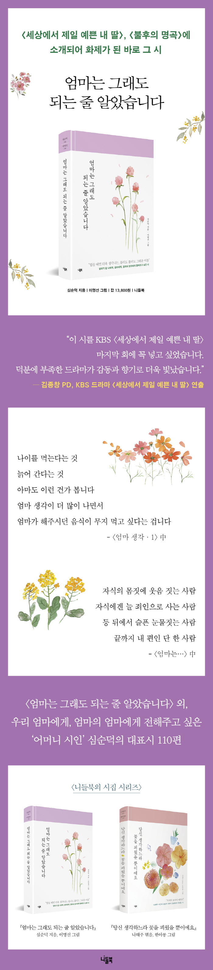 ±¹¹Î ¾ö¸¶, ±¹¹Î µå¶ó¸¶¶ó´Â ¸»Ã³·³ ÀÌÁ¦´Â ¡®±¹¹Î »ç¸ð°î¡¯ÀÌ µÈ ½Ã ¡®¾ö¸¶´Â ±×·¡µµ µÇ´Â ÁÙ ¾Ë¾Ò½À´Ï´Ù¡¯. ÀÌ ½Ã¸¦ KBS ÁÖ¸»±Ø <¼¼»ó¿¡¼ Á¦ÀÏ ¿¹»Û ³» µþ> ¸¶Áö¸· ȸ¿¡ ²À ³Ö°í ½Í¾ú½À´Ï´Ù. ½ÃÀβ²¼ Çã¶ôÇØÁּż ºÎÁ·ÇÑ µå¶ó¸¶°¡ °¨µ¿°ú Çâ±â·Î ´õ¿í ºû³µ½À´Ï´Ù. Àΰ£¿¡ ´ëÇÑ ¿¹ÀǸ¦ ÀÒÁö ¾Ê´Â, ¸¶À½ÀÌ µû¶æÇÑ ½ÃÀÎÀÇ »õ ½ÃÁýÀ» ÃàÇÏÇÕ´Ï´Ù.