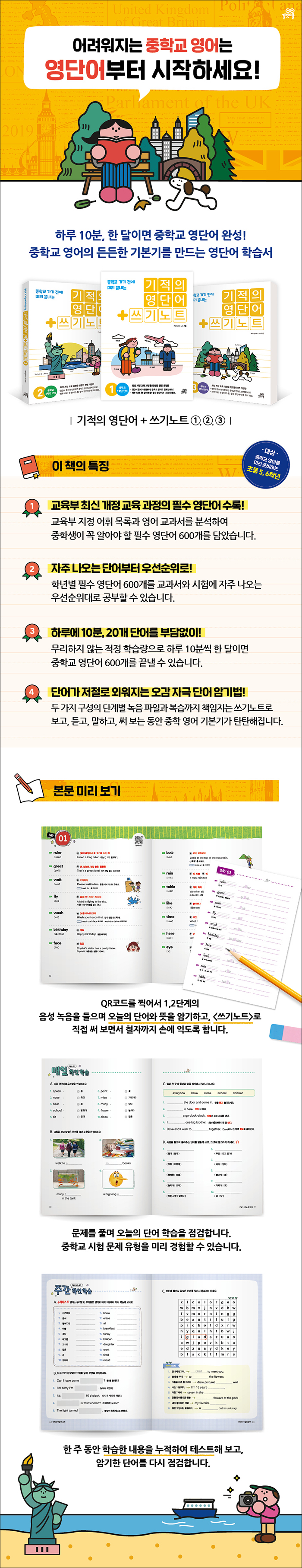 ÇÏ·ç¿¡ 20°³ÀÇ ´Ü¾î¸¦ 10ºÐ¾¿ ¿Ü¿ö ÇÑ ´ÞÀ̸é ÁßÇб³ ¿µ´Ü¾î¸¦ ¸¶½ºÅÍÇÒ ¼ö ÀÖµµ·Ï ±¸¼ºÇß½À´Ï´Ù. 2015³â °³Á¤ ±³À°°úÁ¤ ±âº» ¾îÈÖ ¸ñ·Ï°ú ÁßÇб³ ¿µ¾î ±³°ú¼¸¦ öÀúÈ÷ ºÐ¼®ÇÏ¿© °¢ Çг⺰ 600´Ü¾î¸¦ ¼±Á¤, ÀÚÁÖ ³ª¿À´Â Áß¿äÇÑ ´Ü¾îºÎÅÍ ¿ì¼±¼øÀ§·Î Á¤¸®Çß½À´Ï´Ù. ±³°ú¼¿Í ½ÇÁ¦ ½ÃÇè°ú À¯»çÇÑ ¿¹¹®À» º¸¸ç ´Ü¾îÀÇ ¾²ÀÓÀ» ÀÍÈ÷°í, <¾²±â³ëÆ®>·Î º¹½À±îÁö ¿Ïº®È÷ ÇÕ´Ï´Ù.
