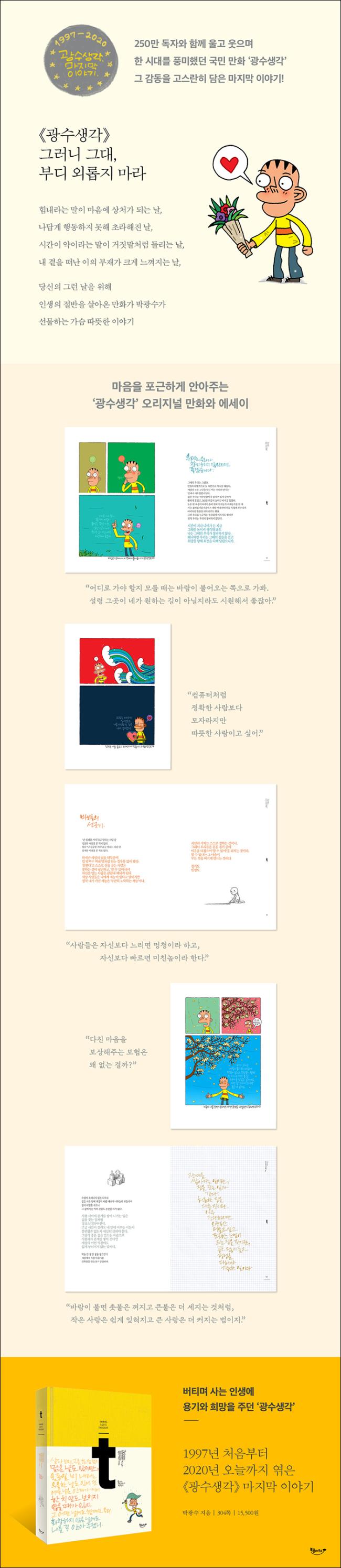(1969)1969³â»ý. ´Ü±¹´ëÇб³ ½Ã°¢µðÀÚÀΰú Á¹¾÷. ¸¸È°¡ÀÌÀÚ ¿¡¼¼À̽ºÆ®. Á¶¼±ÀϺ¸¿¡ 3³â ¹Ý µ¿¾È ¿¬ÀçÇÑ ¸¸È¸¦ Ã¥À¸·Î ¹Àº ¡¶±¤¼ö»ý°¢¡·À¸·Î 250¸¸ µ¶ÀÚÀÇ ¸¶À½À» »ç·ÎÀâÀ¸¸ç º£½ºÆ®¼¿·¯ ÀÛ°¡°¡ µÇ¾ú´Ù. ±× ´öºÐ¿¡ ¡®½Å»Ç¸®¡¯¶ó´Â ij¸¯ÅÍ¿Í ¡®±¤¼öü¡¯¶ó´Â µ¶Æ¯ÇÑ ¼Ã¼·Î ´ëº¯µÇ±âµµ ÇÏ´Â ±×´Â ¡¶±¤¼ö»ý°¢¡· ¿Ü¿¡µµ ¡¶³ª»Û ±¤¼ö»ý°¢¡·, ¡¶±¤¼ö ±¤¼ö¾¾ ±¤¼ö³ð¡·, ¡¶¾Ñ½Î¶óºñ¾Æ¡·, ¡¶Âü ¼Å÷ »ç¶÷µé¡·, ¡¶¾ß±¸»ý°¢¡· µî ´Ù¾çÇÑ »ý°¢°ú Àç´ÉÀ» ´ãÀº ¿¡¼¼ÀÌ Ã¥µéÀ» Æì³Â´Ù. ±×·± ÀÛ°¡°¡ À̹ø¿¡´Â ¡®ÀÎÅͺä¾î¡¯·Î º¯½ÅÇØ Àηù ÃÖ°íÀÇ ¼Ò¸ÁÀÌ¸ç ±× Àڽſ¡°Õ ¿À·£ ¼÷Á¦À̱⵵ Çß´ø Çູ¿¡ °üÇÑ Áú¹®À» ¿ì¸® ÀÌ¿ôµé°ú ³ª´«´Ù. ±×ÀÇ Ã¹ ÀÎÅͺäÁýÀÌ¸ç ¡®ÀÌ¿ô°ú ÇÔ²² ¾´ ±¤¼ö»ý°¢¡¯À̶ó°í ÇÒ ¼ö ÀÖ´Â À̹ø Ã¥Àº µ¿½Ã´ë¸¦ »ì¾Æ°¡´Â º¸Åë»ç¶÷µéÀ̶ó¸é ´©±¸³ª °ø°¨ÇÒ ¼ö ÀÖ´Â ÀλýÀÇ ´ëÈ·ÏÀÌ´Ù.