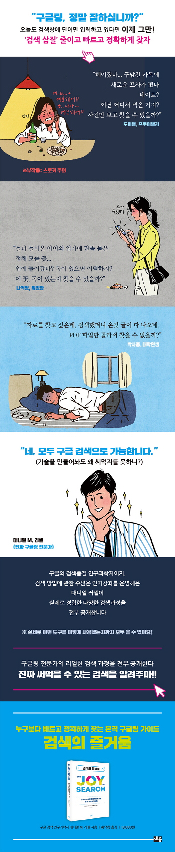 ¡¶°Ë»öÀÇ Áñ°Å¿ò¡·Àº »çÁø ÇÑ ÀåÀ¸·Î ½ÃÀ۵ȴÙ. µµ½ÃÀÇ Ç³°æÀÌ º¸ÀÌ´Â »çÁøÀ¸·Î, ½Ç³»¿¡¼ â¹ÛÀ» ÃÔ¿µÇÑ °ÍÀ¸·Î º¸ÀδÙ. »çÁøÀ» ÁØ »ç¶÷Àº ´ç½Å¿¡°Ô ÀÌ·¸°Ô ¹°À¸¸ç µµ¿òÀ» ûÇÑ´Ù. ¡°¿©±â°¡ ¾îµðÀϱî¿ä? ¿À´Ã±îÁö ²À ã¾Æ³»¾ß¸¸ ÇØ¿ä.¡± ÀÚ, ´ç½ÅÀº ¾îµð¼ºÎÅÍ ¾î¶»°Ô °Ë»öÀ» ½ÃÀÛÇÒ °ÍÀΰ¡? ÀÌ Ã¥ÀÇ ÀúÀÚ ´ë´Ï¾ó ·¯¼¿Àº ±¸±ÛÀÇ °Ë»öºÐ¾ß ¿¬±¸°úÇÐÀÚ·Î, ¸» ±×´ë·Î ÁøÂ¥ ±¸±Û¸µ Àü¹®°¡´Ù. ÀúÀÚ´Â ¸ÕÀú »çÁø ¼Ó¿¡¼ ´Ü¼¸¦ ã°í, »çÁøÀ» ÂïÀº °Ç¹°, ½ÉÁö¾î Ãþ¼ö¿Í ȸ»ç »óÈ£±îÁö ¾Ë¾Æ³½´Ù.