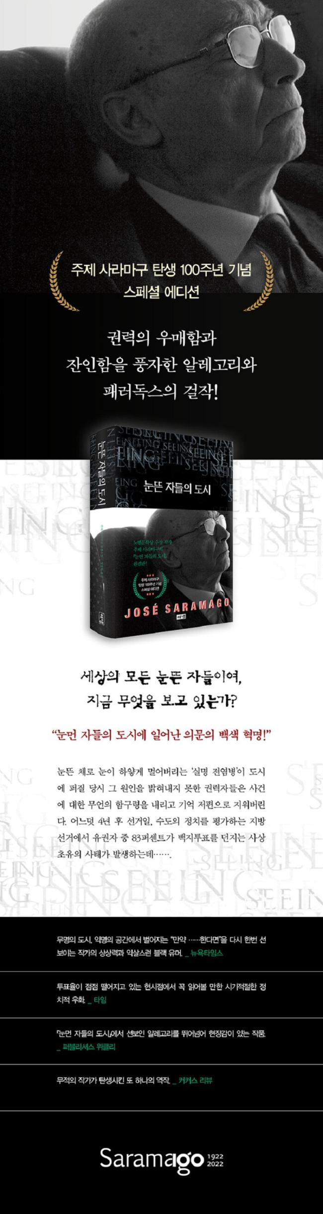 (1922.11.00)1922³â Æ÷¸£Åõ°¥¿¡¼ °¡³ÇÑ ³óºÎÀÇ ¾Æµé·Î ž ¿ëÁ¢°øÀ¸·Î »çȸ»ýȰÀ» ½ÃÀÛÇÑ »ç¶ó¸¶±¸´Â 1947³â ¡ºÁ˾ÇÀÇ ¶¥¡»À» ¹ßÇ¥ÇÏ¸é¼ Ã¢ÀÛ È°µ¿À» ½ÃÀÛÇß´Ù. ±×·¯³ª ±×ÈÄ 19³â°£ ´Ü ÇÑ ÆíÀÇ ¼Ò¼³µµ ¾²Áö ¾Ê°í °ø»ê´ç Ȱµ¿¿¡¸¸ Àü³äÇÏ´Ù°¡, 1968³â ½ÃÁý ¡º°¡´ÉÇÑ ½Ã¡»¸¦ Æì³½ ÈÄ¿¡¾ß ¹®´ÜÀÇ ÁÖ¸ñÀ» ¹Þ±â ½ÃÀÛÇß´Ù. »ç¶ó¸¶±¸ ¹®ÇÐÀÇ Àü¼º±â¸¦ ¿¬ ÀÛǰÀº 1982³â ÀÛ ¡º¼öµµ¿øÀÇ ºñ¸Á·Ï¡»À¸·Î, ±×´Â ÀÌ ÀÛǰÀ¸·Î À¯·´ ÃÖ°íÀÇ ÀÛ°¡·Î ¶°¿Ã¶úÀ¸¸ç 1998³â¿¡´Â ³ëº§¹®ÇлóÀ» ¼ö»óÇß´Ù. ¸¶¸£Äɽº, º¸¸£Ç콺¿Í ÇÔ²² 20¼¼±â ¼¼°è¹®ÇÐÀÇ °ÅÀåÀ¸·Î ²ÅÈ÷´Â »ç¶ó¸¶±¸´Â ȯ»óÀû ¸®¾ó¸®Áò ¾È¿¡¼µµ °³Àΰú ¿ª»ç, Çö½Ç°ú Ç㱸¸¦ °¡·ÎÁö¸£¸ç ¿ìÈÀû ºñÀ¯¿Í ½Å¶öÇÑ Ç³ÀÚ, °æ°è ¾ø´Â »ó»ó·ÂÀ¸·Î ÀڽŸ¸ÀÇ µ¶Æ¯ÇÑ ¹®Çм¼°è¸¦ ±¸ÃàÇØ ¿Ô´Ù. ¿©µçÀϰöÀÇ ³ªÀ̰¡ ¹«»öÇÒ ¸¸Å ¿Õ¼ºÇÑ ±×ÀÇ Ã¢ÀÛ È°µ¿Àº ¼¼°èÀÇ ¼ö¸¹Àº ÀÛ°¡¸¦ °í¹«ÇÏ°í µ¶ÀÚ¸¦ ¸Å·á½Ã۸ç ÀÛ°¡Á¤½ÅÀÇ »ì¾Æ Àִ ǥº»À¸·Î ºÒ¸®°í ÀÖ´Ù