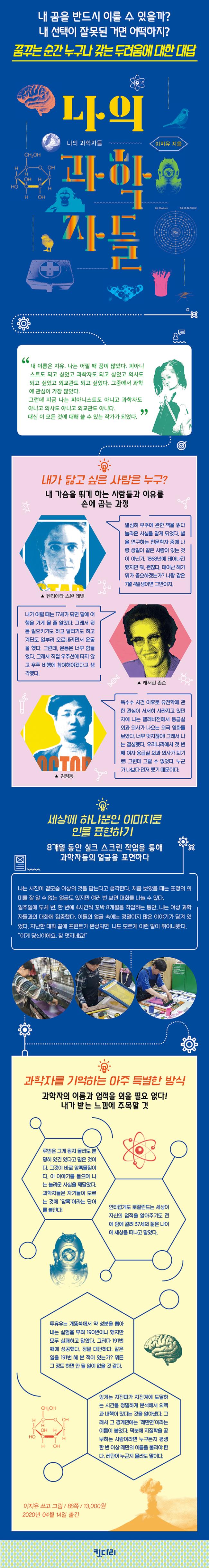 ÀÛ°¡ ÀÌÁöÀ¯´Â ÀÌ Ã¥ ¡¶³ªÀÇ °úÇÐÀڵ顷À» ÅëÇØ ¼¼»óÀÌ ¾Ë¾ÆÁÖÁö ¾Ê¾Æµµ ¹¬¹¬ÇÏ°Ô Àڱ⠱æÀ» °É¾î¿Â ¿©¼º °úÇÐÀÚµéÀÇ Á¸À縦 ÀڽŸ¸ÀÇ ¹æ½ÄÀ¸·Î µå·¯³»°íÀÚ ÇÑ´Ù. 8°³¿ù µ¿¾È ½ÇÅ© ½ºÅ©¸° ÀÛ¾÷¿¡ ¸ôµÎÇϸç ÀÛ°¡´Â ÀÚ½ÅÀÌ µ¿°æÇÑ °úÇÐÀÚµéÀÇ ¾ó±¼À» À̹ÌÁöÈÇÏ´Â ÀÛ¾÷ÀÌ ÀÚ±â ÀڽŰú ´ëÈÇÏ´Â °úÁ¤À̾úÀ½À» ±ú´Ý´Â´Ù.