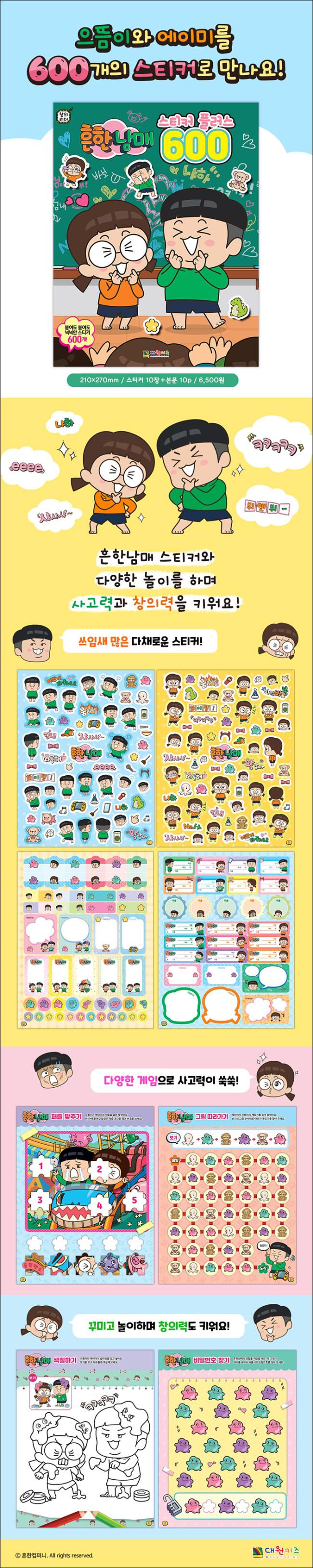 À¸¶äÀÌ¿Í ¿¡À̹ÌÀÇ ½ºÆ¼Ä¿°¡ 600°³! ÈçÇѳ²¸ÅÀÇ À¯Äè ¹ß¶öÇÑ ÀÏ»óÀ» 600°³ÀÇ ½ºÆ¼Ä¿·Î ¸¸³ª º¸¼¼¿ä. ¹Ì·Î ã±â, ºñ¹Ð¹øÈ£ ã±â, ´Ù¸¥ ±×¸² ã±â µî ½ºÆ¼Ä¿¸¦ Ȱ¿ëÇÑ ´Ù¾çÇÑ °ÔÀÓÀ» ÅëÇØ ÁýÁ߷°ú »ç°í·ÂÀ» Ű¿ï ¼ö ÀÖ½À´Ï´Ù. ¾ËÂù ±¸¼ºÀÇ ½ºÆ¼Ä¿¸¦ ÀÚÀ¯·Ó°Ô Ȱ¿ëÇϸç âÀǷ°ú Ç¥Çö·Âµµ ÀÚ¶ó³³´Ï´Ù.