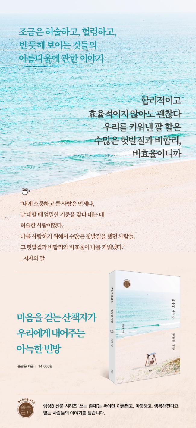 ¡¶¸¶À½ÀÌ Á¶±ÝÀº Çæ··ÇÑ »ç¶÷¡·Àº ¸¶À½À» °È´Â »êÃ¥ÀÚ°¡ ¿ì¸®¿¡°Ô ³»¾îÁÖ´Â ¾Æ´ÁÇÑ ºó¹æ °°Àº ¿¡¼¼ÀÌ´Ù. ÀúÀÚ´Â Á¶±ÝÀº Çã¼úÇϰí, Çæ··Çϰí, ºó µíÇØ º¸ÀÌ´Â °Íµé¿¡ ´«°ú ±Í¸¦ ±â¿ïÀÌ°í ±×ÀÇ ¼ÒÁßÇÑ ÀÏ»óÀ» ³Ê±×·¯ÀÌ º£Ç¬´Ù. ÀڽŻӸ¸ ¾Æ´Ï¶ó ŸÀο¡°Ô ±â²¨ÀÌ ¿©À¯·Ó°í ´ÜÁ¤ÇÑ ºó¹æÀ» ³»¾îÁÖ´Â ¸¶À½, ¡®¼º°øÇÑ »ç¶÷¡¯º¸´Ù´Â ¡®ÁÁÀº »ç¶÷¡¯ÀÌ µÇ±â À§ÇØ Çæ··ÇÑ »îÀ» ÁöÇâÇÏ´Â ÀúÀÚÀÇ ¼ºÀå°ú ³ó´ã, ±×¸®°í ±Û¾²±â¿¡ °üÇÑ À̾߱⸦ ´ã¾Ò´Ù.