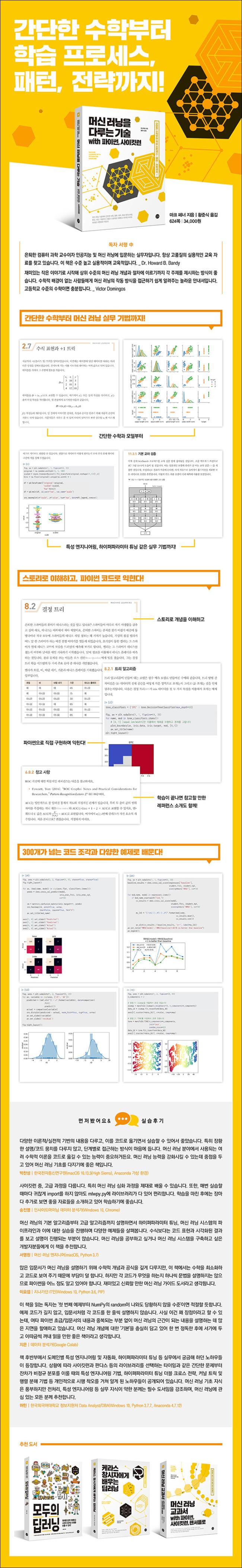 ¸Ó½Å ·¯´× °°Àº ¼öÇÐÀû ÁÖÁ¦¸¦ ´Ù·ç´Â Ã¥ ´ëºÎºÐÀº ÃʽÉÀÚ¿¡°Ô À̾߱⸦ µé·ÁÁÖµíÀÌ ¼ö½ÄÀ» º¸¿© ÁÝ´Ï´Ù. Á¦ »ý°¢¿¡ ±×·¯ÇÑ ¹æ½ÄÀº ¼öÇÐÀ» ÁÁ¾ÆÇÏ´Â »ç¶÷Á¶Â÷ Ã¥À» µ¤°Ô ¸¸µé °ÍÀÔ´Ï´Ù. ½Ã°¢Àû, ¾ð¾îÀû ¼³¸íÀ» ÄÚµå¿Í ÇÔ²² ¼Ò°³ÇÏ´Â °ÍÀÌ ¸Ó½Å ·¯´×ÀÇ ÇÁ·Î¼¼½º ÀÌÇØ¸¦ µ½´Â´Ù°í »ý°¢ÇÕ´Ï´Ù. Àú´Â »Ä¼Ó±îÁö ÄÄÇ»ÅÍ °úÇÐÀÚÀÔ´Ï´Ù. ¹«¾ð°¡¸¦ ¸¸µå´Â °ÍÀ» ÁÁ¾ÆÇÏÁÒ. ¹«¾ð°¡¸¦ ¸¸µé ¼ö ÀÖ´Â ¼öÁØ¿¡ ´Ù´Ù¸£¸é ±×°ÍÀ» Áø½ÉÀ¸·Î ÀÌÇØÇß´Ù°í »ý°¢ÇÕ´Ï´Ù. ÀÌ·¯ÇÑ Ç¥ÇöÀ» µé¾î º» Àû ÀÖÀ» °ÍÀÔ´Ï´Ù. ¡°¹«¾ð°¡¸¦ ÁøÁ¤À¸·Î ÀÌÇØÇÏ°í ½Í´Ù¸é, ´Ù¸¥ »ç¶÷¿¡°Ô °¡¸£ÃÄ º¸¶ó.¡± 2źµµ ÀÖ½À´Ï´Ù. ¡°¹«¾ð°¡¸¦ ÁøÁ¤À¸·Î ÀÌÇØÇÏ°í ½Í´Ù¸é, ÄÄÇ»ÅͰ¡ ±×°ÍÀ» Çϵµ·Ï °¡¸£ÃĶó.¡± À̰ÍÀÌ Á¦°¡ ¿©·¯ºÐ¿¡°Ô ¸Ó½Å ·¯´×À» °¡¸£Ä¡´Â ¹æ¹ýÀÔ´Ï´Ù. ¼öÇÐÀûÀÎ ³»¿ëÀ» ÃÖ¼ÒÈÇÏ¸é¼ °¡Àå ³Î¸® »ç¿ëÇÏ´Â ¸Ó½Å ·¯´× µµ±¸¿Í ±â¹ý¿¡ ¼û¾î ÀÖ´Â °³³äÀ» ¼Ò°³ÇÒ °ÍÀÔ´Ï´Ù. ±×·¯°í ³ª¼ ÄÄÇ»ÅÍ¿¡ ±× ÀÛ¾÷À» ¾î¶»°Ô ½ÃŰ´ÂÁö ¹Ù·Î º¸¿© ÁÖ·Á°í ÇÕ´Ï´Ù. ¸ðµç °ÍÀ» ¹Ù´ÚºÎÅÍ ±¸ÇöÇÏÁö´Â ¾ÊÀ» °ÍÀÔ´Ï´Ù. °ÅÀÎÀÇ ¾î±ú À§¿¡ ¿Ã¶ó¼¼ ¾ÆÁÖ °·ÂÇÑ ¼ÒÇÁÆ®¿þ¾î ¶óÀ̺귯¸®¸¦ »ç¿ëÇÏ¿© ½Ã°£À» ¾Æ³¥ °ÍÀÔ´Ï´Ù.
