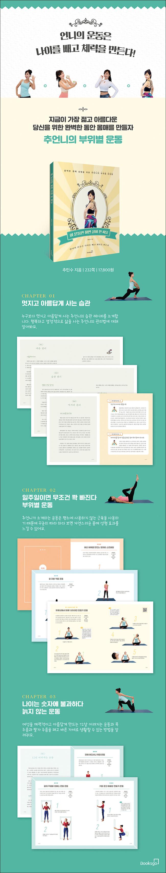 [ÀÌ ¿îµ¿¸¸ ÇÏ¸é »ìÀÌ ¾È ÂÇ¿ä]´Â 25¸¸ ±¸µ¶ÀÚ¼ö¸¦ °¡Áö°í ÀÖ´Â ¡®Ãß¾ð´Ï¡¯ Ã߹μö°¡ ¼Ò°³ÇÏ´Â °Ç°ÇÑ »îÀ» À§ÇÑ ¿îµ¿ °¡À̵åÀÌ´Ù. 30³â °¡±îÀÌ ¿©¼º Àü¹® ÇÇÆ®´Ï½º¸¦ °¡¸£Ä¡°í ¿¬±¸ÇÏ¸ç ¿À·£ °æÇè°ú ³ëÇϿ츦 °¡Áø ±×³à°¡ ¼Ò°³ÇÏ´Â ¿îµ¿À» ´ã°í ÀÖ´Ù. ÀÌ Ã¥¿¡¼´Â ¿©¼ºµé ƯÈ÷ 4050´ëÀÇ ¿©¼ºµéÀÇ °í¹ÎÀÎ ³ªÀÕ»ìÀ» »©´Â ¹æ¹ý°ú ºÎÀ§º° ¿îµ¿ ¹æ¹ýÀ» Á¦°øÇÑ´Ù. ±×»Ó¸¸ ¾Æ´Ï¶ó ÀÚ½ÅÀÇ Æò¼Ò »ýȰ½À°ü°ú ¸¶Àε带 Á¤ºñÇÏ°í °Ç°ÇÑ ½Ä½À°üÀ» ¸¸µé ¼ö ÀÖ´Â ÆÁÀ» Á¦°øÇÑ´Ù. ¶ÇÇÑ ¹«ÀÛÁ¤ Èûµé°í, ¾î·Æ°í, º¹ÀâÇÑ µ¿ÀÛÀÌ ¾Æ´Ñ ÀÚ½ÅÀÇ ¸öÀ» ÀÌÇØÇÏ°í ±×µ¿¾È »ç¿ëÇÏÁö ¾Ê¾Ò´ø ±ÙÀ°À» »ç¿ëÇϱ⿡ °¡Àå È¿°úÀûÀÎ ¿îµ¿À» ¾ö¼±ÇÏ¿© ¼ö·ÏÇÏ¿´´Ù. ªÀº ½Ã°£ ¾È¿¡ Å« È¿°ú¸¦ °¡Á® ¿À¸é¼ Áö·çÇÏÁö ¾Ê°í Àç¹ÌÀÖ°Ô ¿îµ¿ÇÏ´Â ¹æ¹ý°ú ÀÏ»ó»ýȰ¿¡¼ ²ÙÁØÈ÷ ÇÒ ¼ö ÀÖ´Â ¹æ¹ýÀ» Á¦½ÃÇÏ¿´´Ù. ¶ÇÇÑ ÄÉ°Ö ¿îµ¿°ú ´Ù¾çÇÑ °ñ¹Ý ¿îµ¿ µîÀ¸·Î ¿©¼º¿¡°Ô °¡Àå ÇÊ¿äÇÑ ¿îµ¿À» Á¦°øÇÏ¸ç ³ªÀÕ»ìÀ» »©°í µ¿¾È ¸ö¸Å·Î ¸¸µå´Â ¹æ¹ýÀ» ¼³¸íÇÏ¿´´Ù.