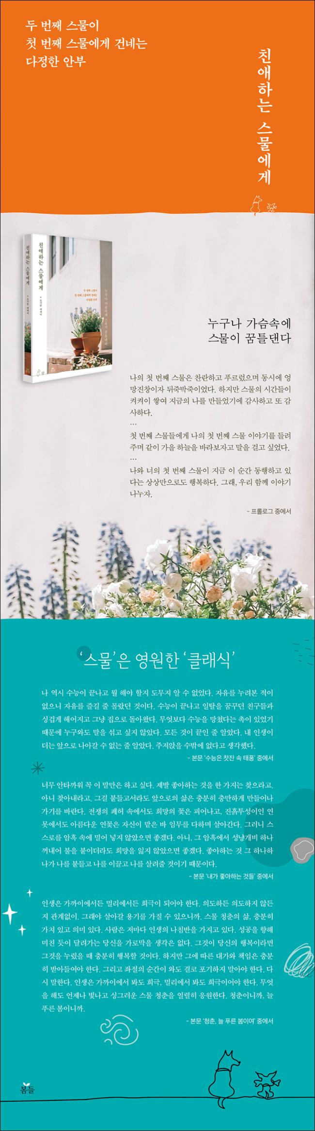 ³ªÀÇ Ã¹ ¹øÂ° ½º¹°Àº Âù¶õÇϰí Ǫ¸£·¶À¸¸ç µ¿½Ã¿¡ ¾û¸ÁÁøÃ¢ÀÌÀÚ µÚÁ×¹ÚÁ×À̾ú´Ù. ÇÏÁö¸¸ ½º¹°ÀÇ ½Ã°£µéÀÌ ÄÑÄÑÀÌ ½×¿© Áö±ÝÀÇ ³ª¸¦ ¸¸µé¾ú±â¿¡ °¨»çÇÏ°í ¶Ç °¨»çÇÏ´Ù. ù ¹øÂ° ½º¹°µé¿¡°Ô ³ªÀÇ Ã¹ ¹øÂ° ½º¹° À̾߱⸦ µé·ÁÁÖ¸ç °°ÀÌ °¡À» ÇÏ´ÃÀ» ¹Ù¶óº¸ÀÚ°í ¸»À» °É°í ½Í¾ú´Ù. ³ª¿Í ³ÊÀÇ Ã¹ ¹øÂ° ½º¹°ÀÌ Áö±Ý ÀÌ ¼ø°£ µ¿ÇàÇϰí ÀÖ´Ù´Â »ó»ó¸¸À¸·Îµµ ÇູÇÏ´Ù. ±×·¡, ¿ì¸® ÇÔ²² À̾߱⠳ª´©ÀÚ.