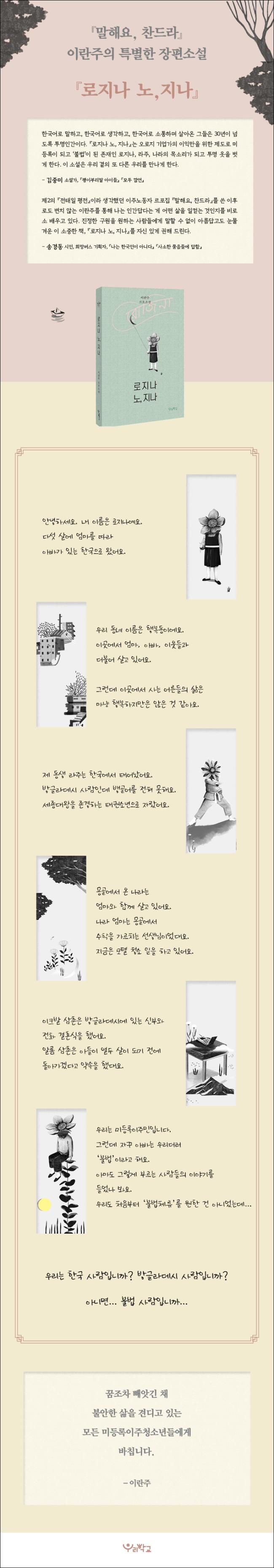 Çѱ¹¾î·Î ¸»Çϰí, Çѱ¹¾î·Î »ý°¢Çϰí, Çѱ¹¾î·Î ¼ÒÅëÇÏ¸ç »ì¾Æ¿Â ±×µéÀº 30³âÀÌ ³Ñµµ·Ï Åõ¸íÀΰ£ÀÌ´Ù. ´ëÇѹα¹Àº ÀÌÁֳ뵿ÀÚµéÀÇ °ª½Ñ ³ëµ¿·Â¸¸À» ¿øÇßÁö¸¸ ±×µéÀº ±â°è°¡ ¾Æ´Ï¾úÀ¸¹Ç·Î ÀÌÁÖ¹ÎÀ¸·Î, ÀÌÁÖ°¡Á·À¸·Î ¿ì¸® ÀÌ¿ôÀÌ µÇ¾ú´Ù. ¼Ò¼³Àº ¡®¿Ü±¹Àλê¾÷±â¼ú¿¬¼ö»ýÁ¦µµ¡¯·Î ½ÃÀÛÇØ ´Ù½Ã ¡®°í¿ëÇã°¡Á¦¡¯·Î À̾îÁö´Â 30³â°£ ÀÌÁֳ뵿ÀÚµéÀÇ »îÀ» ÁÖ¸ñÇÑ´Ù. ¿À·ÎÁö ±â¾÷°¡ÀÇ ÀÌÀ͸¸À» À§ÇÑ Á¦µµ·Î ¹Ìµî·ÏÀÌ µÇ°í ºÒ¹ýÀÌ µÈ Á¸Àç, ·ÎÁö³ª, ¶óÁÖ, ³ª¶óÀÇ ¸ñ¼Ò¸®°¡ µÇ°í Åõ¸í ¿ÊÀ» ¹þ°Ô ÇÑ´Ù. ¡º·ÎÁö³ª ³ë, Áö³ª¡»´Â ¿ì¸® °çÀÇ ¶Ç ´Ù¸¥ ¿ì¸®¸¦ ¸¸³ª°Ô ÇÑ´Ù.