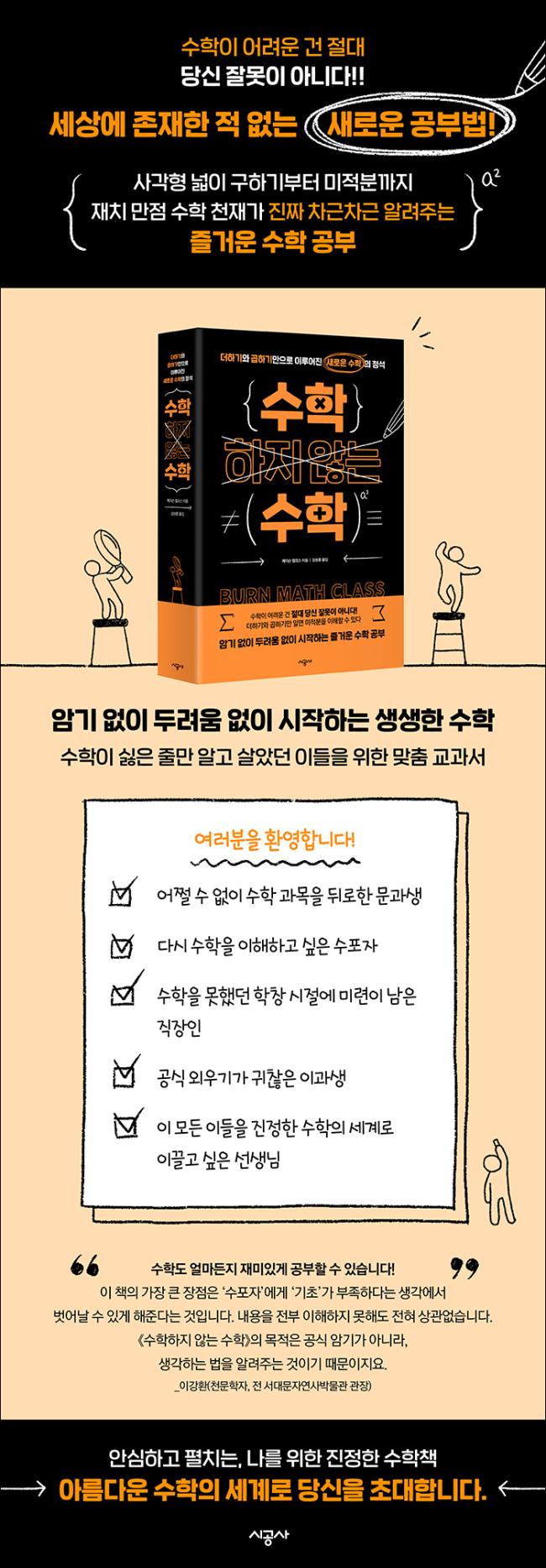 ¼öÇÐÀ» °øºÎÇØº¸°í ½Í´Ù°í »ý°¢ÇÏ´Â »ç¶÷µé¿¡°Ô °¡Àå Å« º®À¸·Î ´Ù°¡¿À´Â °Ç ¡®±âÃÊ¡¯°¡ ºÎÁ·ÇÏ´Ù´Â Áö·¹ÁüÀÛÀÌ ¾Æ´Ò±î ÇÕ´Ï´Ù. ÀÌ Ã¥ÀÇ °¡Àå Å« ÀåÁ¡Àº ÀÌ·± »ý°¢¿¡¼ ¹þ¾î³¯ ¼ö ÀÖ°Ô ÇØÁشٴ °ÍÀÔ´Ï´Ù. ¼¼¼¼ÇÑ ³»¿ëÀ» ¸ðµÎ ÀÌÇØÇÏÁö ¸øÇصµ »ó°ü¾ø½À´Ï´Ù. ¡¶¼öÇÐÇÏÁö ¾Ê´Â ¼öÇС·ÀÇ ¸ñÀûÀº ¼öÇп¡ ´ëÇÑ »ç½ÇÀû Áö½ÄÀ» ¾Ï±âÇÏ´Â ¹ýÀÌ ¾Æ´Ï¶ó »ý°¢ÇÏ´Â ¹æ¹ýÀ» ¾Ë·ÁÁÖ´Â °ÍÀ̱⠶§¹®ÀÔ´Ï´Ù. _À̰ȯ, õ¹®ÇÐÀÚ, Àü ¼´ë¹®ÀÚ¿¬»ç¹Ú¹°°ü °üÀå