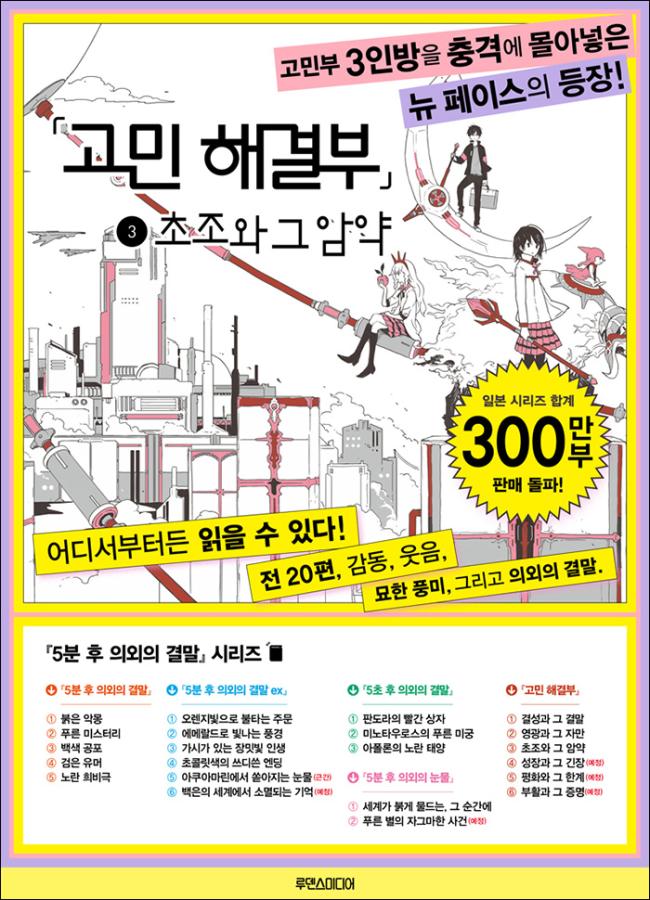 Çѱ¹¾î ¹ø¿ª¼·Î´Â ¡ºÇູÀ» ¹ß°ßÇÏ´Â ½Ã°£¡»(»ýȰ¼º¼»ç), ¡º5ÃÊ ÈÄ ÀÇ¿ÜÀÇ °á¸» ¨ç ÆÇµµ¶óÀÇ »¡°£ »óÀÚ¡», ¡º5ÃÊ ÈÄ ÀÇ¿ÜÀÇ °á¸» ¨è ¹Ì³ëŸ¿ì·Î½ºÀÇ Çª¸¥ ¹Ì±Ã¡»(·çµ§½º¹Ìµð¾î)ÀÌ ÀÖ´Ù.