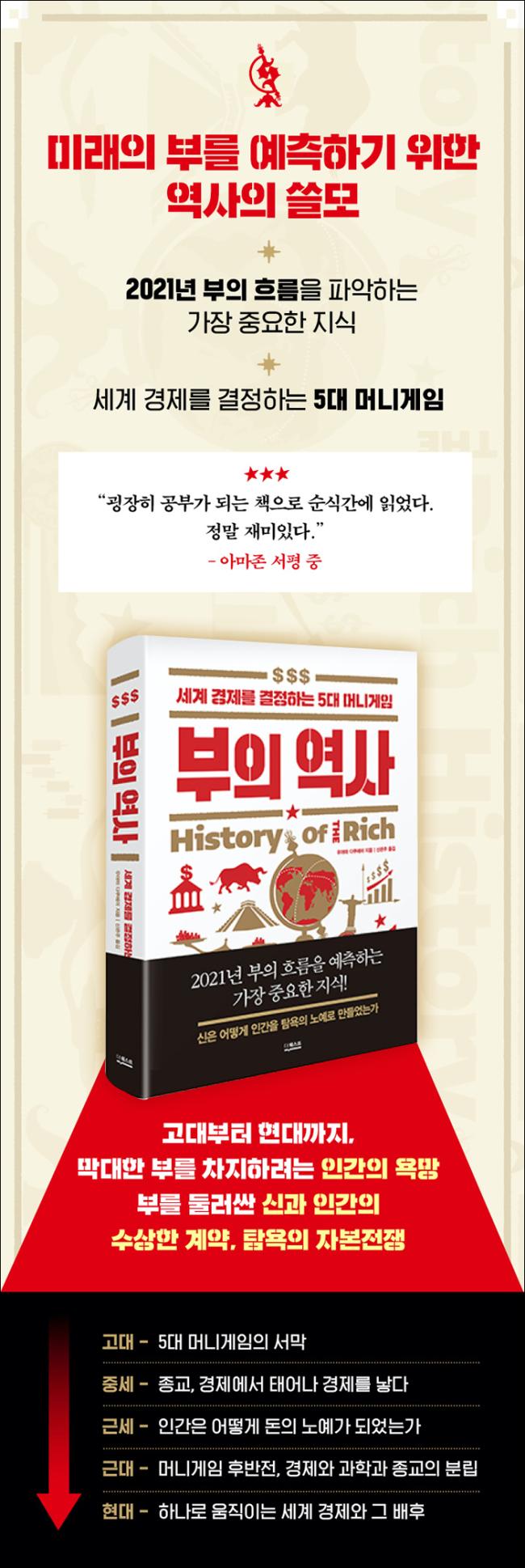 À۳⿡ ÀÌ¾î ¿ÃÇØµµ »ç¶÷µéÀÇ ÈµÎ´Â ¡®¾î¶»°Ô ÇÏ¸é ºÎÀÚ°¡ µÉ ¼ö ÀÖÀ» °ÍÀΰ¡¡¯ÀÏ °ÍÀÌ´Ù. ±×¿¡ ´ëÇÑ ´äÀ» ã±â À§Çؼ´Â ¡®Áö±Ý±îÁö Àΰ£Àº ¾î¶»°Ô ºÎÀÚ°¡ µÇ¾î¿Ô´Â°¡¡¯¸¦ ¾Æ´Â °ÍÀÌ Áß¿äÇѵ¥ ºÎÀÇ ¿ª»ç¿¡¼ ¾ÆÁÖ Áß¿äÇÑ ±âÃàÀÌ µÇ´Â ¿ä¼Ò°¡ ¹Ù·Î Á¾±³´Ù. Àΰ£Àº Á¾±³¸¦ ¸¸µé¾î³»°í Ȱ¿ëÇÏ¿© ºÎÀÚ°¡ µÇ¾î¿Ô±â ¶§¹®ÀÌ´Ù. ¡¶ºÎÀÇ ¿ª»ç¡·´Â ¿ª»ç ¼Ó °æÁ¦¿Í Á¾±³ÀÇ ±â¹ÐÇÑ °ü°è¸¦ ÆÄÇìÄ¡´Â »ö´Ù¸¥ ÁÖÁ¦¸¦ ´Ù·é´Ù. ÀúÀÚÀÇ ÁÖÀåÀº ÆÄ°ÝÀûÀÌ´Ù. ÀúÀÚ¿¡ µû¸£¸é Áö±Ý±îÁö ¼¼°è °æÁ¦¸¦ °áÁ¤Çؿ 5´ë ¸Ó´Ï°ÔÀÓÀÇ Á߽ɿ¡´Â Á¾±³°¡ ÀÚ¸®ÇÑ´Ù.