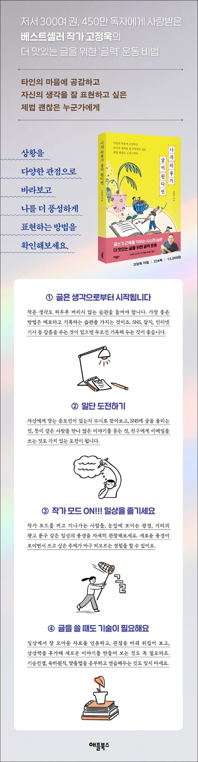 ÀÛ°¡³ª ±ÛÀ» ¾²´Â »ç¶÷ÀÌ Ã¥¹æÀ» ¸Ö¸®ÇÑ´Ù´Â °Ç ¿ä¸®»ç°¡ µÇ°Ú´Ù´Â »ç¶÷ÀÌ ½ÃÀå¿¡ °¡Áö ¾Ê´Â °Í°ú ¶È°°´Ù. ½Å¼±ÇÑ ½ÄÀç·á°¡ ¹¹°¡ ³ª¿Ô´ÂÁö ¸ÅÀÏ °¡¼ È®ÀÎÇÏ°í ½Î°í ÁÁÀº ¹°°ÇÀ» ±¸ÇØ¾ß ±× »ç¶÷ÀÇ ¿ä¸®°¡ ºû³ªµí ÁÁÀº ÀÛ°¡°¡ µÇ°í ÁÁÀº ±ÛÀ» ¾²°íÀÚÇÏ´Â »ç¶÷À̶ó¸é »ýÁã°¡ Ç®¹æ±¸¸® µå³ªµéµí ¼Á¡À» ´Ù³à¾ß ÇÑ´Ù. ¼Á¡¿¡ °¥ ¶§¸¶´Ù °¡½¿ÀÌ ¼³·¹°í »õ·Î ³ª¿Â Ã¥À» µéÃ纸¸ç ±× ³»¿ë¿¡ ºüÁ®µé¾î¾ß ÇÑ´Ù. »ì±î ¸»±î¸¦ ¼ö¾øÀÌ ¸Á¼³ÀÌ´Ù°¡ µ·À» ÁöºÒÇÏ°í ¼ÒÁßÇÏ°Ô µé°í ³ª¿Í ¿À´Â ±æ¿¡ ´Ù ÀÐ¾î ¹ö¸° °æÇè ÇÑ ¹ø ÇÏÁö ¾ÊÀº »ç¶÷ÀÌ ±ÛÀ» ¾´´Ù´Â °ÍÀº ¾ð¾îµµ´ÜÀÌ´Ù. ±ÛÀÌ ¸ðÀÌ´Â ½À°üÀº °¡±î¿î µ¿³× ´Ü°ñ ¼Á¡À» ¸¸µå´Â °ÍÀÌ´Ù.