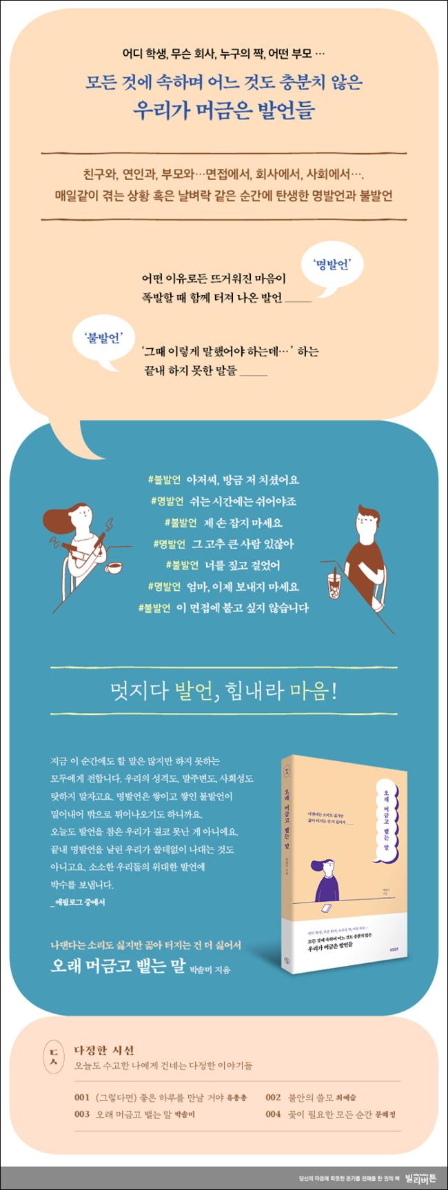 <¿À·¡ ¸Ó±Ý°í ¹ñ´Â ¸»>ÀÇ ÀÛ°¡ ¹Ú¼Ö¹Ì´Â Áý, ȸ»ç, ¸ðÀÓ µî ´Ù¾çÇÑ °ü°è¿Í Àå¼Ò¿¡¼ ź»ýÇÑ ¸í¹ß¾ð(¶ß°Å¿öÁø ¸¶À½ÀÌ Æø¹ßÇÒ ¶§ ÅÍÁ® ³ª¿Â ¹ß¾ð)°ú ±×·¯Áö ¸øÇÑ ºÒ¹ß¾ð(¡®±×¶§ ±× ¸»À» Çß¾î¾ß Çϴµ¥¡¯ Çϸç ÈÄȸÇÏ´Â ¸¶À½)À» ÅëÇØ, ŸÀÎÀÇ ½Ã¼±¿¡¼ ¹þ¾î³ª °¨Á¤¿¡ ¼ÖÁ÷ÇØÁö°í »ý°¢À» ¸íÈ®ÇÏ°Ô À̾߱âÇÒ ¼ö ÀÖ´Â ¿ë±â¸¦ ÀüÇÑ´Ù. ÀÛ°¡´Â »ó´ëÀÇ ±Ç·ÂÀ̳ª Àǹ«°¨, Àº¹ÐÇÏ°Ô ÇнÀµÈ ŵµ·Î ÀÎÇØ ¿ì¸®´Â ¸í¹ß¾ðÀ» ³»¹ñÁö ¾Ê°í ºÒ¹Ý¾ðÀ» ¸¶À½¼Ó¿¡ ½×´ÂÁöµµ ¸ð¸¥´Ù°í À̾߱âÇÑ´Ù. ÀÌ·± ÀÌÀ¯·Î ¸í¹ß¾ðÀ» ÅͶ߸®°í ³ µÚ¿¡µµ ¼Ó ½Ã¿øÇÔ°ú µ¿½Ã¿¡ ¸¶À½ ¾îµò°¡¿¡ ºÒÆíÇÑ ¸¶À½ÀÌ ÀÚ¸®ÇÏ´ÂÁö ¸ð¸¥´Ù. ±×·³¿¡µµ Á¶±Ý¾¿ ¿ë±â¸¦ ³»¾î ºÒÄèÇϰųª ¹«·ÊÇÏÁö ¾Ê°Ô ³» ÀǰßÀ» ³»´Â ¿¬½ÀÀ» ÇØ¾ß ÇÑ´Ù. ÀúÀÚ´Â ¾î¶² À§ÇèÀ» °¨¼öÇÏ°í ¸í¹ß¾ðÀ» ÇÏ´Â À̵鿡°Ô´Â ¹Ú¼ö¸¦, ŸÀÎÀ» À§ÇÑ ¹è·Á·Î ºÒÇÕ¸®ÇÑ »óȲÀ» °ßµð´Â À̵鿡°Ô´Â Á¶±Ý¾¿ ³» »ý°¢À» ÀüÇÒ ¼ö ÀÖ´Â ¿ë±â¸¦ ÁØ´Ù.