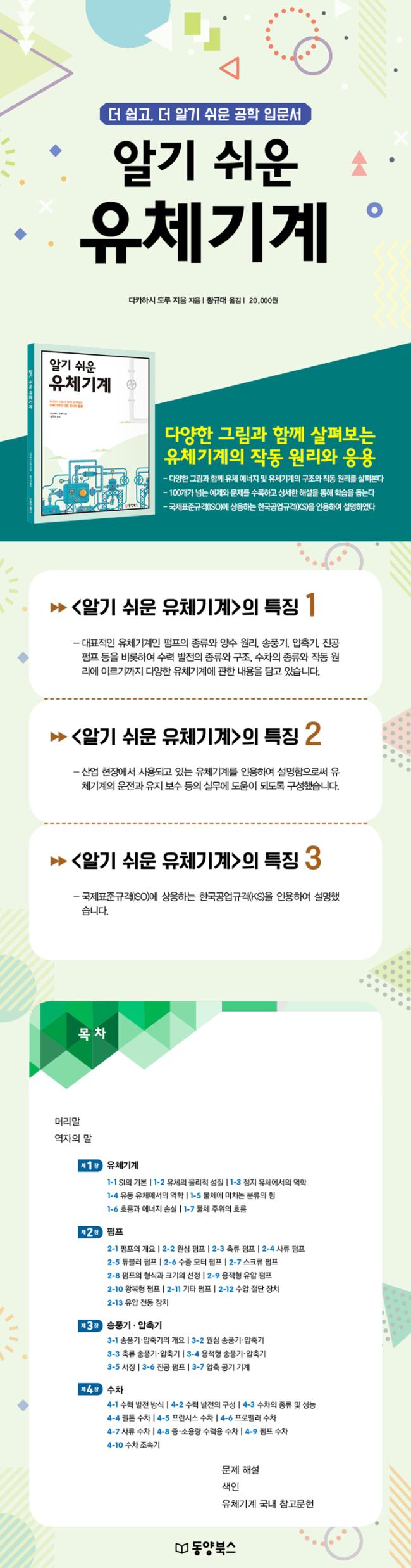 ÀÌ Ã¥¿¡¼´Â À¯Ã¼±â°èÀÇ ÀÛµ¿ ¿ø¸®¸¦ ÀÌÇØÇϱâ À§ÇØ 1Àå¿¡¼ À¯Ã¼ÀÇ ¹°¸®Àû ¼ºÁú, Á¤Áö À¯Ã¼¿Í À¯µ¿ À¯Ã¼¿¡¼ÀÇ ¿ªÇÐ, ºÐ·ù, ¿¡³ÊÁö º¯È¯ µî À¯Ã¼¿ªÇÐÀÇ ÇÙ½É ³»¿ëÀ» ´Ù·ç¾ú´Ù. 2Àå¿¡¼´Â ÆßÇÁÀÇ Á¾·ù¿Í °¡Àå ÀϹÝÀûÀ¸·Î »ç¿ëµÇ´Â ¿ø½É ÆßÇÁÀÇ ¾ç¼ö ¿ø¸®¿¡ ´ëÇØ ¼³¸íÇÏ¿´°í Ư¼º °î¼±À» ÅëÇÑ ÆßÇÁ ¼±Á¤¹ý°ú ÆßÇÁ ¿îÀü ½Ã ¹ß»ýÇÒ ¼ö ÀÖ´Â ÀÌ»ó Çö»óÀΠijºñÅ×À̼ǿ¡ ´ëÇÑ ¹æÁöÃ¥¿¡ ´ëÇØ¼µµ ¼¼úÇÏ¿´´Ù. ¶ÇÇÑ, 3Àå¿¡¼´Â ¾ÐÃ༺ À¯Ã¼ÀÎ °ø±â³ª ´Ù¸¥ ±âü¸¦ Ȱ¿ëÇÏ´Â ¼Ûdz±â¿Í ¾ÐÃà±â, Áø°ø ÆßÇÁ µî¿¡ ´ëÇØ ¼³¸íÇÏ¿´°í 4Àå¿¡¼´Â ¼ö·Â ¹ßÀüÀÇ Á¾·ù¿Í ±¸Á¶¿¡ ´ëÇÑ ¼³¸í°ú À¯Ã¼ÀÇ À§Ä¡¿¡³ÊÁö¸¦ ¿îµ¿¿¡³ÊÁö·Î º¯È¯½ÃŰ´Â ¼öÂ÷ÀÇ Á¾·ù¿Í ÀÛµ¿ ¿ø¸®¿¡ ´ëÇØ ¾ð±ÞÇÏ¿´´Ù.