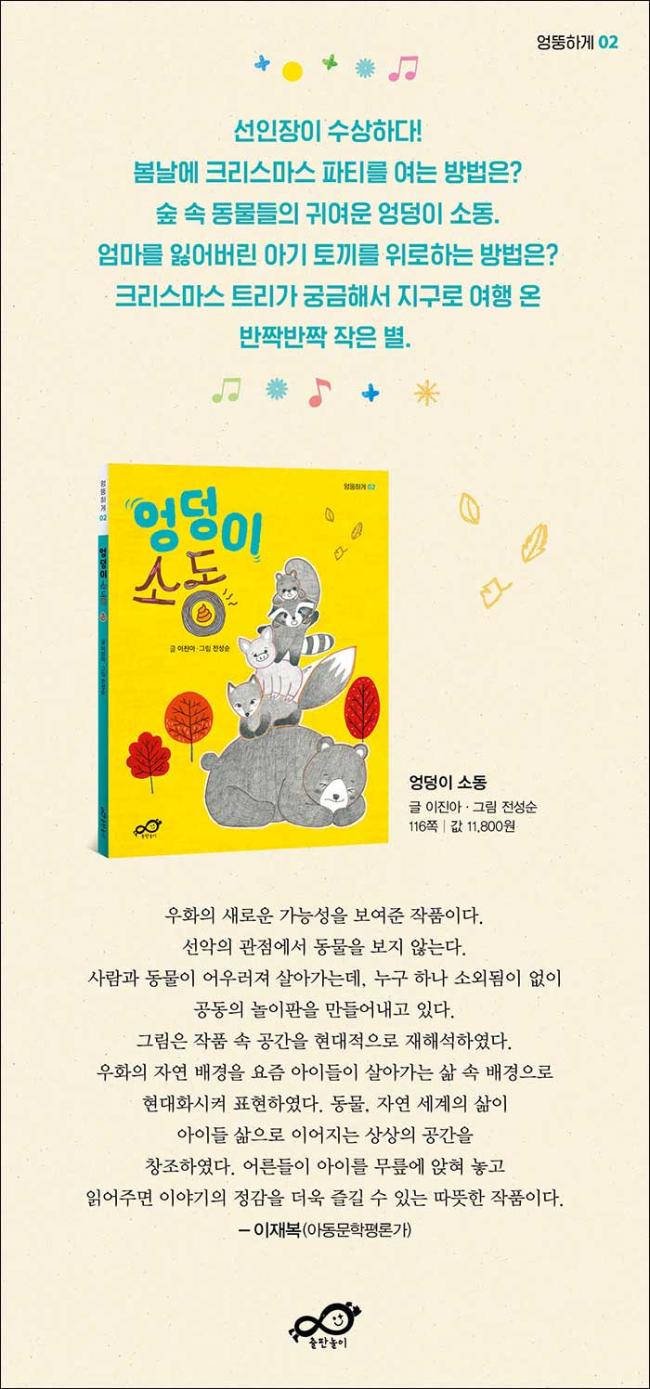 ¡º¾ûµ¢ÀÌ ¼Òµ¿¡»Àº ¿ìÈÀÇ »õ·Î¿î °¡´É¼ºÀ» º¸¿©ÁØ ÀÛǰÀÌ´Ù. ¼±¾ÇÀÇ °üÁ¡¿¡¼ µ¿¹°À» º¸Áö ¾Ê´Â´Ù. »ç¶÷°ú µ¿¹°ÀÌ ¾î¿ì·¯Á® »ì¾Æ°¡´Âµ¥, ´©±¸ Çϳª ¼Ò¿ÜµÊÀÌ ¾øÀÌ, °øµ¿ÀÇ ³îÀÌÆÇÀ» ¸¸µé¾î³»°í ÀÖ´Ù. ±×¸²Àº ÀÛǰ ¼Ó °ø°£À» Çö´ëÀûÀ¸·Î ÀçÇØ¼®ÇÏ¿´´Ù. ¿ìÈÀÇ ÀÚ¿¬ ¹è°æÀ» ¿äÁò ¾ÆÀ̵éÀÌ »ì¾Æ°¡´Â »î ¼Ó ¹è°æÀ¸·Î Çö´ëȽÃÄÑ Ç¥ÇöÇÏ¿´´Ù. µ¿¹°, ÀÚ¿¬ ¼¼°èÀÇ »îÀÌ ¾ÆÀÌµé »îÀ¸·Î À̾îÁö´Â »ó»óÀÇ °ø°£À» âÁ¶ÇÏ¿´´Ù. ¾î¸¥µéÀÌ ¾ÆÀ̸¦ ¹«¸¿¡ ¾ÉÇô ³õ°í ÀоîÁÖ¸é À̾߱âÀÇ Á¤°¨À» ´õ¿í Áñ±æ ¼ö ÀÖ´Â µû¶æÇÑ ÀÛǰÀÌ´Ù.