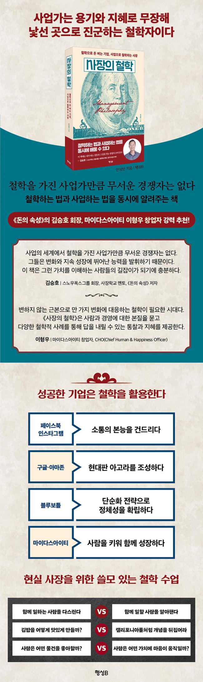 »ç¾÷Àº ´Ü¼øÈ÷ ¹°°Ç°ú ¼ºñ½º¸¦ ÆÈ°í »ç´Â ÀÏÀÌ ¾Æ´Ï´Ù. »ç¶÷À» ¾Ë°í, ½Ã´ë¸¦ Àаí, °¡Ä¡¸¦ âÁ¶ÇÏ´Â Á¾ÇÕ¿¹¼úÀÌ´Ù. ±× Á߽ɿ¡ »ç¾÷°¡ÀÇ Ã¶ÇÐÀÌ ÀÖ´Ù. ¼º°øÇÏ´Â »ç¾÷°¡´Â Àڱ⸸ÀÇ ºÐ¸íÇÑ Ã¶ÇÐÀÌ ÀÖÀ¸¸ç, öÇÐÇÏ´Â ¹æ¹ýÀ» ¹è¿ì°í ÀÍÈù´Ù¸é ½ÇÆÐ¸¦ ÁÙÀÌ´Â °ÍÀº ¹°·Ð ¼¼»óÀ» ¾Æ¸§´ä°Ô ¸¸µå´Â ÀÏ¿¡ ÀÏÁ¶ÇÒ ¼ö ÀÖ´Ù. ¡º»çÀåÀÇ Ã¶ÇС»Àº ¼º°øÇÏ´Â ±â¾÷°ú °æ¿µÀÚµéÀÇ Ã¶ÇÐÀÌ »ç¾÷°ú ¾î¶² ¿¬°üÀÌ ÀÖ´ÂÁö¸¦ ¾Ë¸®°í Ȱ¿ëÇϱâ À§ÇÑ ¸ñÀûÀ¸·Î ¾²¿©Á³´Ù.
