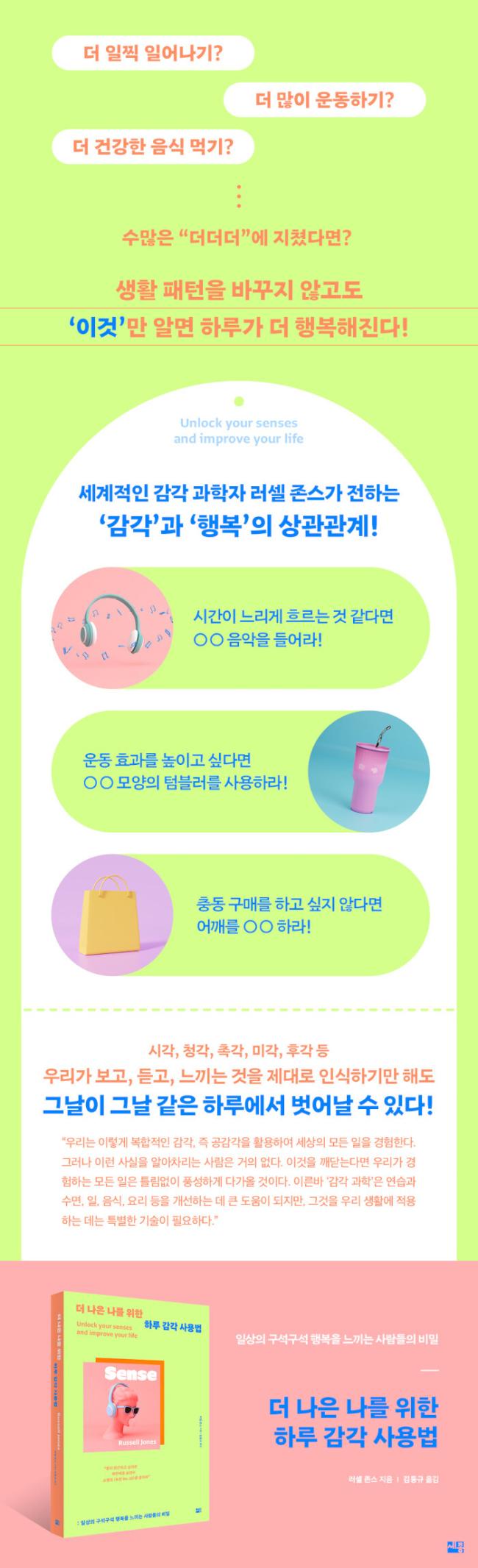 Çâ±â¸¦ ÅëÇØ âÀÇÀû »ç°í¸¦ ÁõÁøÇÏ´Â ¹ýÀ̳ª ¼Ò¸®°¡ À½½ÄÀÇ ¸À¿¡ ¹ÌÄ¡´Â ¿µÇâ µî °¨°¢ °úÇÐÀû Áö½ÄÀ» ÀÌ¿ëÇØ »ýȰÀÇ ¸ðµç ¿µ¿ªÀ» ´õ¿í dz¼ºÇÏ°Ô ÇÏ´Â ¹æ¹ýÀ» ¿¬±¸ÇؿԴÙ. ÀÌ´Â ¾ÆÄ§À» »óÄèÇÏ°Ô ¸ÂÀÌÇϱâ, ÀÏÀÇ È¿À²À» ³ôÀ̱â, Åð±Ù ÈÄ ½Ã°£À» Àß º¸³»±âºÎÅÍ ¼÷¸éÀ» À§ÇÑ ¼ö¸é °úÇÐÀÇ ¿µ¿ª±îÁö ³ª¾Æ°£´Ù. ÀÌ·± °¨°¢ °úÇÐÀÇ ±Ã±ØÀû ¸ñÀûÀº ¼¼»ó¿¡ ´ëÇÑ ¿ì¸®ÀÇ °æÇèÀ» ´õ¿í Å©°Ô °³¼±ÇÏ°í ´õ ³ªÀº ¡®³ª¡¯¿Í ¡®³ªÀÇ ÇϷ硯¸¦ ¸¸µé¾î°¡´Â °ÍÀÌ´Ù.