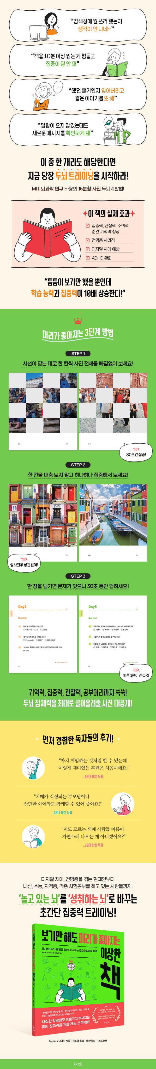 ¡¶º¸±â¸¸ ÇØµµ ¸Ó¸®°¡ ÁÁ¾ÆÁö´Â ÀÌ»óÇÑ Ã¥¡·Àº °øºÎ³ª ½ÃÇè, µðÁöÅÐ Ä¡¸Å µî ÁýÁ߷°ú ±â¾ï·ÂÀ¸·Î ¾î·Á¿òÀ» °Þ´Â À̵éÀ» À§ÇØ MIT ³ú°úÇÐ ¿¬±¸ ¼º°ú¸¦ ¹ÙÅÁÀ¸·Î ÇÑ ¡®16ºÐÇÒ »çÁø µÎ³úÇâ»ó¹ý¡¯À» ´ã°í ÀÖ´Ù. ±×Áß¿¡¼µµ ƯÈ÷ È¿°ú°¡ ÁÁ¾Ò´ø »çÁøµé¸¸ ¸ð¾Æ ³ªÀÌ¿Í ¼ºº°À» ºÒ¹®ÇÏ°í ´©±¸³ª ½±°Ô ½ÇõÇÒ ¼ö ÀÖµµ·Ï 4ÁÖ Æ®·¹ÀÌ´× ±¸¼ºÀ¸·Î Á¤¸®Çß´Ù. ½ÇÁ¦·Î ÀÌ Ã¥ÀÇ ¹æ¹ý´ë·Î ÈÆ·ÃÇÑ µÚ ³î¶ó¿ï Á¤µµ·Î ÁýÁ߷°ú ±â¾ï·ÂÀÌ Çâ»óµÇ¾ú´Ù´Â ¼ö