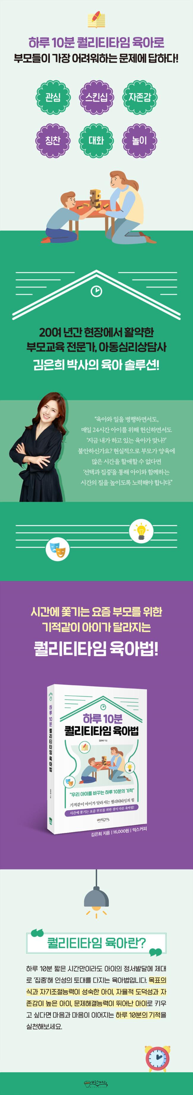 ¡ºÇÏ·ç 10ºÐ Ä÷¸®Æ¼Å¸ÀÓ À°¾Æ¹ý¡»Àº ±èÀºÈñ ¼ÒÀåó·³ À°¾Æ¿Í ÀÏÀ» º´ÇàÇϸ鼵µ ´Ã ÁËÃ¥°¨À» °¡Áö°í ÀÖ´Â ºÎ¸ðµéÀ» À§ÇÑ Ã¥ÀÌ´Ù. ¶Ç ¸ÅÀÏ 24½Ã°£ ¾ÆÀ̸¦ À§ÇØ Çå½ÅÇÏÁö¸¸ ¡®Áö±Ý ³»°¡ Çϰí ÀÖ´Â À°¾Æ°¡ ¸Â³ª?¡¯ ºÒ¾ÈÇÑ ºÎ¸ðµéÀ» À§ÇØ Áú ÁÁÀº À°¾Æ¿¡ ´ëÇÑ ¹æÇâÀ» ¾È³»ÇÑ´Ù. ÀúÀÚ°¡ Á¦½ÃÇÑ ¡®°ü½É¡¯ ¡®½ºÅ²½Ê¡¯ ¡®ÀÚÁ¸°¨¡¯ ¡®ÄªÂù¡¯ ¡®´ëÈ¡¯ ¡®³îÀÌ¡¯ µîÀº À°¾Æ¿¡¼ »©³õÀ» ¼ö ¾ø´Â Áß¿äÇÑ Å°¿öµå´Ù. ÇÏÁö¸¸ À̸¦ È¿°úÀûÀ¸·Î Ȱ¿ëÇÒ ¼ö ÀÖ´Â ºÎ¸ð´Â ¸¹Áö ¾Ê´Ù. ÀúÀÚ´Â ÀÌ Ã¥ÀÇ Á¦¸ñó·³ ªÀº ½Ã°£ µ¿¾È Á¦´ë·Î µÈ Ä÷¸®Æ¼Å¸ÀÓ À°¾Æ¹ýÀ» ÅëÇØ ±àÁ¤ÀûÀÎ ¡®ºÎ¸ð-Àڳ࡯ °ü°è¸¦ Çü¼ºÇϰí, ¾ÆÀÌÀÇ ¹Ù¸¥ Àμº°ú ÀÚÁ¸°¨À» Ű¿ï ¼ö Àֱ⸦ ¼Ò¸ÁÇÑ´Ù.