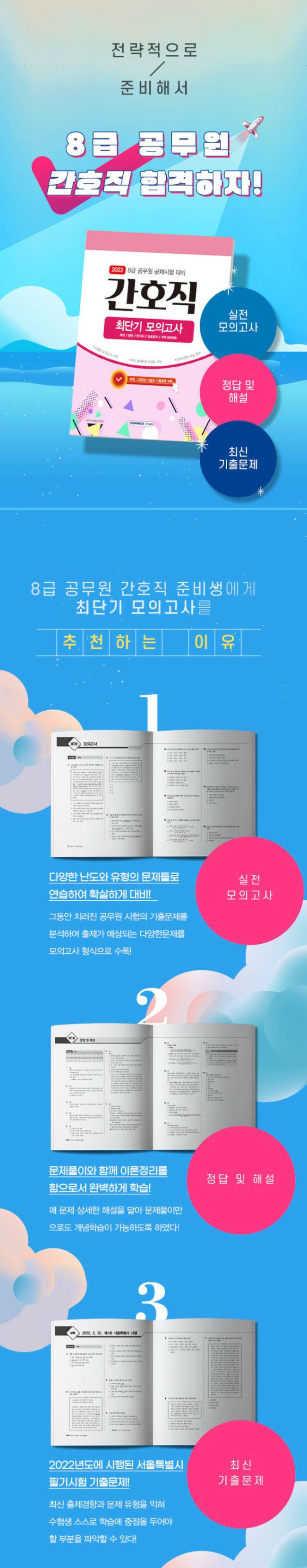 ½ÇÁ¦ ½ÃÇèó·³ ÇÑ È¸¸¦ <±¹¾î/¿µ¾î/Çѱ¹»ç/°£È£°ü¸®/Áö¿ª»çȸ°£È£>·Î ±¸¼º, ÃÑ 10ȸºÐÀ» ¼ö·ÏÇÏ¿´À¸¸ç, °¢ °ú¸ñ¸¶´Ù ÃÖ±Ù ÃâÁ¦°æÇâÀ» ¹ÙÅÁÀ¸·Î ÇÑ ÃâÁ¦°¡ ¿¹»óµÇ´Â ¹®Á¦¸¦ ¾ö¼±ÇÏ¿© ´ã¾Æ ¹®Á¦Ç®À̸¦ ÅëÇØ ½ÃÇè¿¡ ´ëÇÑ °¨À» ÀÍÈ÷°í ´Ù¾çÇÑ ÃâÁ¦ À¯ÇüÀ» ÆÄ¾ÇÇÒ ¼ö ÀÖµµ·Ï ÇÏ¿´´Ù. ¶ÇÇÑ °¢ ¹®Á¦¸¶´Ù Á¤¡¤¿À´ä¿¡ ´ëÇÑ »ó¼¼ÇÑ ÇØ¼³°ú º¸Ãæ ¼³¸íÀ» ÷ºÎÇÏ¿© µû·Î ÀÌ·ÐÀ» ã¾ÆºÁ¾ß ÇÏ´Â ¹ø°Å·Î¿òÀ» ÁÙ¿© º¸´Ù È¿À²ÀûÀÎ ÇнÀÀÌ °¡´ÉÇϵµ·Ï ÇÏ¿´´Ù. ºÎ·ÏÀ¸·Î 2022³âµµ Áö¹æ°ø¹«¿ø ÀÓ¿ë Çʱâ½ÃÇè ¹®Á¦¿Í ´ä¾ÈÁö¸¦ ÇÔ²² Á¦°øÇÏ¿© ÃֽбâÃâ¹®Á¦¸¦ Ç®¾îº¼ ¼ö ÀÖµµ·Ï ÇÏ¿´À¸¸ç, ´ä¾ÈÁö¿¡ Á÷Á¢ ´ä¾ÈÀ» ÀÛ¼ºÀ» ÇØº¸´Â µî ½ÇÁ¦ ½ÃÇè¿¡ ´ëÇÑ ¿Ïº®ÇÑ ¿¬½ÀÀ» ÇÒ ¼ö ÀÖ°Ô ÇÏ¿´´Ù.