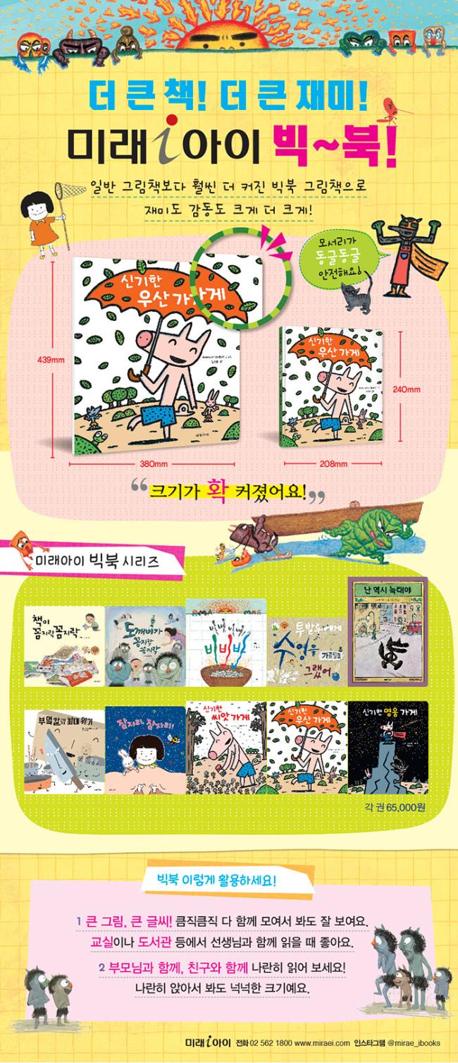 ¡®ºòºÏ(BigBook)¡¯Àº ±âÁ¸ÀÇ ±×¸²Ã¥º¸´Ù Å©±â¸¦ È® Ű¿î Å« ±×¸²Ã¥À¸·Î, ¿©·¯ ¸íÀÌ ÇÔ²² ÀÐÀ» ¼ö À־ ±³½ÇÀ̳ª µµ¼­°ü µî¿¡¼­ Ã¥ Àбâ¿Í °­¿¬ µî ´Ù¾çÇÏ°Ô È°¿ë °¡´ÉÇÕ´Ï´Ù. ¶ÇÇÑ Å« ±×¸²°ú ±ÛÀÚ ´öºÐ¿¡ ¾ÆÀ̵éÀÇ ÁýÁßµµ¸¦ ³ôÀÌ°í ´õ¿í Áñ°Ì°Ô °¨»óÇÒ ¼ö ÀÖ½À´Ï´Ù. Ã¥ Å©±â°¡ Ä¿Áø ¸¸Å­ ¾ÆÀ̵éÀÇ ¾ÈÀüµµ °í·ÁÇÏ¿© ¸ð¼­¸®¸¦ µÕ±Û°Ô ó¸®ÇÏ¿´½À´Ï´Ù. ¡®¹Ì·¡¾ÆÀÌ ºòºÏ¡¯ ½Ã¸®Áî´Â ¹Ì·¡¾ÆÀÌÀÇ ´Ù¾çÇÑ ±×¸²Ã¥ Áß¿¡¼­ °¡Àå »ç¶û¹Þ´Â Ã¥µéÀ» ¾ö¼±ÇÏ¿© °è¼Ó µ¶ÀÚµéÀ» ã¾Æ°¥ °ÍÀÔ´Ï´Ù.