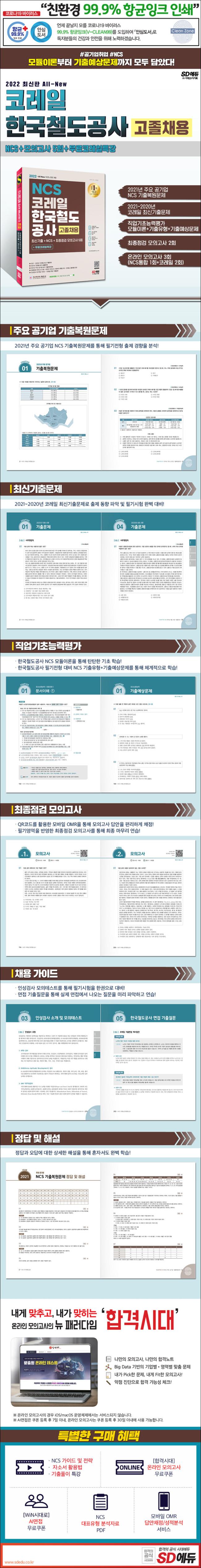 ÄÚ·¹ÀÏ °íÁ¹Ã¤¿ë Çʱâ½ÃÇè ÇÕ°ÝÀ» À§ÇØ SD¿¡µà¿¡¼­´Â 2022 ä¿ëÀ» ´ëºñÇÏ¿© ÄÚ·¹ÀÏ ¸ÂÃãÇü ¹®Á¦·Î ±¸¼ºÇÑ ¡º2022 ÃÖ½ÅÆÇ All-New ÄÚ·¹ÀÏ Çѱ¹Ã¶µµ°ø»ç °íÁ¹Ã¤¿ë NCS+¸ðÀǰí»ç 5ȸ+¹«·áÄÚ·¹ÀÏÆ¯°­¡»À» Ãâ°£ÇÏ¿´´Ù. »ó¼¼ÇÑ ÇØ¼³·Î È¥ÀÚ¼­µµ ÇнÀÀÌ °¡´ÉÇϵµ·Ï ÇÏ¿´À¸¸ç, ÃÖ½ÅÃâÁ¦ °æÇâ¿¡ ¸ÂÃá ÃÖÁ¾Á¡°Ë ¸ðÀǰí»ç¸¦ ¼ö·ÏÇÏ¿© ÄÚ·¹ÀÏ °íÁ¹Ã¤¿ë ¹®Á¦ À¯Çü¿¡ ´ëÇÑ ½ÇÁ¦ÀûÀÎ ÈÆ·ÃÀ» ÇÒ ¼ö ÀÖµµ·Ï ÇÏ¿´´Ù. ¶ÇÇÑ ¿Â¶óÀÎ ¸ðÀǰí»ç¸¦ ¹«·á·Î ÀÀ½ÃÇÒ ¼ö ÀÖ´Â ÄíÆùÀ» Á¦°øÇÏ¿© ÀÚ½ÅÀÇ ½Ç·ÂÀ» ÃÖÁ¾ Á¡°ËÇÒ ¼ö ÀÖµµ·Ï ÇÏ¿´´Ù.