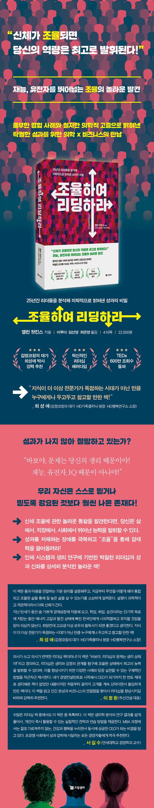 ÀÇ»çÀÌÀÚ ÄÞÇø®Æ®Complete ±â¾÷ÀÇ °øµ¿ ¼³¸³ÀÚÀÌ¸é¼ CEO. ¾Ù·±Àº ÀÇ»ç·Î Áö³»¸é¼ ½É¸®Çаú ¸é¿ªÇÐ ¹Ú»çÇÐÀ§¸¦ ¹Þ¾Ò´Ù. ÀÇ»ç·Î ÀÏÇÏ´Â °ÍÀÌ Áñ°Å¿üÁö¸¸ ¿øÇÏ´Â ¸¸Å »ç¶÷µé¿¡°Ô °¡±îÀÌ ´Ù°¡°¥ ¼ö ¾ø´Ù´Â °ÍÀ» ±ú´Ý°í ÀÇ·á°è¸¦ ¶°³µ´Ù. Çõ½ÅÀûÀÎ ±â¼ú ½ºÅ¸Æ®¾÷¿¡¼ FTSE 100 ´ë±â¾÷¿¡ À̸£±â±îÁö ¸®´õ½Ê ¿ª·®À» º¯È½Ã۰í, Á¶Á÷ ¹®È¸¦ °³¹ßÇϰí, Á÷¿øÀÇ Á¤½Å °Ç°À» Å©°Ô °³¼±ÇÏ´Â ¹æ¹ýÀ» Á¶¾ðÇÏ´Â ¸®´õ½Ê ÄÁ¼³ÆÃ ȸ»çÀÎ ÄÞÇø®Æ®¸¦ ¼³¸³ÇØ Áö±Ý±îÁö 25³â°£ ¼ö¸¹Àº ±â¾÷ ¹× ¸®´õµé°ú ÀÏÇØ ¿À°í ÀÖ´Ù. ÀÇ»çÀ̱⵵ Çß´ø ¾Ù·±Àº ºñÁî´Ï½º¿¡ ÀÇÇÐÀ» Á¢¸ñÇØ, ¾î¶»°Ô ¸®´õ¿Í Á÷¿øµéÀÌ È¿À²ÀûÀ¸·Î ¼º°ú¸¦ ³»°í ¿¡³ÊÁö¸¦ À¯ÁöÇØ ´õ ³ªÀº »îÀ» »ì ¼ö ÀÖ´ÂÁö¸¦ ¿¬±¸Çß´Ù. °ú°Å¿Í Çö´ëÀÇ ¼ö¸¹Àº ¿¬±¸ °á°ú¸¦ »ìÆìº¸°í ¾öû³ ÅëÂûÀ» ¹ß°ßÇÑ ±×´Â °³ÀÎÀÇ ¿ª·®°ú ´É·ÂÀº Àç´ÉÀ̳ª À¯ÀüÀÚ, IQ°¡ ¾Æ´Ñ »ý¸®, °¨Á¤, ÀÎÁö, Çൿ Á¶À²°ú °ü·Ã ÀÖÀ½À» ¾Ë°Ô µÇ¾ú´Ù. ¶ÇÇÑ, Áö±Ý±îÁö ¼ö¸¹Àº ¸®´õ¸¦ ÄÚĪÇÑ °æÇè »ç·Ê¸¦ ÅëÇØ ½ÉÀå, È£Èí, ´À³¦, »ç°í µî Àΰ£ÀÇ ±âº»Àû ½Ã½ºÅÛÀ» Àϰü¼º ÀÖ°Ô Á¶À²¸¸ ÇØµµ ´©±¸³ª ÃÖ°íÀÇ ¼º°ú¸¦ ³¾ ¼ö ÀÖÀ½À» ¹ß°ßÇß´Ù. ÀÌ Ã¥Àº ½Åü ½Ã½ºÅÛÀÇ Á¶À²¿¡ °üÇÑ Á¤ÀÇ, ¹æ¹ý, ´Ù¾çÇÑ ±â¼ú¿¡ ´ëÇØ »ó¼¼È÷ ¾Ë·ÁÁÖ¸é¼ ¾î¶»°Ô »î¿¡¼, Á÷Àå¿¡¼, »çȸ¿¡¼ ¿ª·®À» ¹ßÈÖÇÏ°í ¼º°ú¸¦ ³¾ ¼ö ÀÖ´ÂÁö¸¦ »ó¼¼È÷ ±â¼úÇß´Ù. ÀÇÇп¡ ±â¹ÝÇÑ Å¹¿ùÇÑ ¼º°ú ºñ¹Ð¿¡ °üÇÑ ±×ÀÇ °¿¬µéÀº TEDx¿¡¼µµ Á¶È¸¼ö 600¸¸À» µ¹ÆÄÇÏ¸ç ¾öû³ Àα⸦ ¸ð¾ÒÀ¸¸ç, ¹æ¼Û, ¶óµð¿À, °¿¬ µî¿¡¼µµ Ȱ¹ßÈ÷ Ȱµ¿ ÁßÀÌ´Ù.