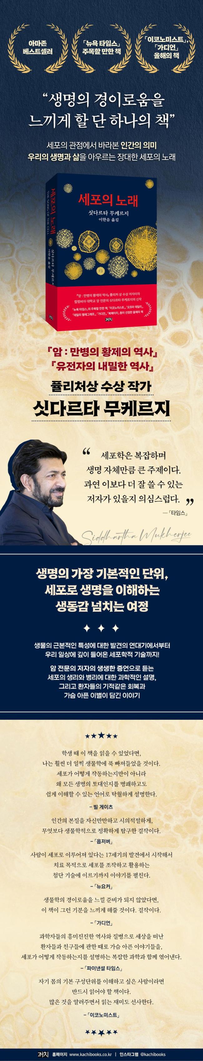 ¡º¾Ï : ¸¸º´ÀÇ È²Á¦ÀÇ ¿ª»ç¡»·Î ǽ¸®Ã³ »óÀ» ¼ö»óÇϰí, ¡ºÀ¯ÀüÀÚÀÇ ³»¹ÐÇÑ ¿ª»ç¡»¸¦ Ãâ°£ÇÏÀÚ¸¶ÀÚ ¡¸´º¿å ŸÀÓ½º¡¹ º£½ºÆ®¼¿·¯¿¡ ¿À¸¥, ÀÇ»çÀÌÀÚ ÀúÀÚÀÎ ½Ë´Ù¸£Å¸ ¹«Äɸ£Áö°¡ À̹ø¿¡ ÁÖ¸ñÇÑ °ÍÀº ¹Ù·Î »ý¸íÀÇ °¡Àå ±âº» ´ÜÀ§ÀÌÀÚ ±× ¸ðµç °ÍÀÎ ¡°¼¼Æ÷¡±ÀÌ´Ù. ÀúÀÚ´Â »ý¹°Çаú ÀÇÇÐ ºÐ¾ß¸¦ ¿µ±¸È÷ º¯È½ÃŲ ¼¼Æ÷ÀÇ ¹ß°ßÀ» ½ÃÀÛÀ¸·Î, ¼¼Æ÷ÀÇ ±âº»Àû ±â´ÉÀÇ ÀÌÇØºÎÅÍ Ãֽм¼Æ÷¿ä¹ý µîÀ» ÀúÀÚ Æ¯À¯ÀÇ Å¹¿ùÇÑ ±Û ¼Ø¾¾·Î Ç®¾î³½´Ù.