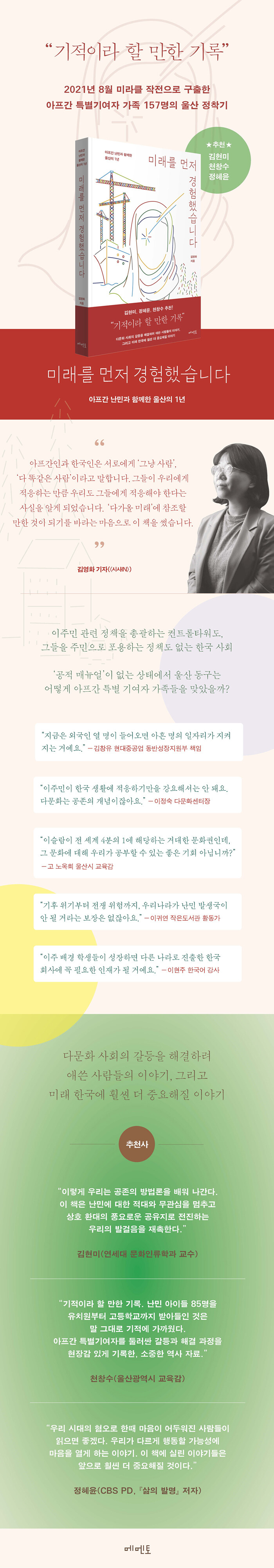 ÀÌ Ã¥Àº 2021³â 8¿ù ¡®¹Ì¶óŬ ÀÛÀü¡¯À¸·Î Ä«ºÒ¿¡¼ ±¸ÃâÇÑ ¾ÆÇÁ°£ Ưº°±â¿©ÀÚ °¡Á·(ÃÑ 391¸í) Áß ¿ï»ê¿¡ Á¤ÂøÇÑ 157¸í°ú ±×µéÀ» ÀÌ¿ôÀ¸·Î ¹Þ¾ÆµéÀÎ »ç¶÷µéÀÇ À̾߱â´Ù. ¹Ì¶óŬ ÀÛÀüÀº Å»·¹¹ÝÀÌ ¾ÆÇÁ°£À» Àå¾ÇÇÑ ÈÄ Çѱ¹ Á¤ºÎ¿¡ ±¸Á¶¸¦ ¿äûÇÑ ¾ÆÇÁ°£ÀεéÀ» °ø±º ¼ö¼Û±â·Î À̼ÛÇÑ Àü·Ê ¾ø´ø ±º»çÀÛÀüÀÌ´Ù. ¾ÆÇÁ°£ Ưº°±â¿©ÀÚµéÀº ¾ÆÇÁ°£ °øÀû°³¹ß¿øÁ¶(ODA) °ü·Ã Çѱ¹ ±â°ü°ú ¹Ù±×¶÷ Çѱ¹º´¿ø µî¿¡¼ ÀÏÇÑ ÇöÁö Çù·ÂÀÚµé·Î, Å»·¹¹Ý¿¡°Ô ºÎ¿ªÀڷΠó´ÜµÉ À§ÇèÀ» ÇÇÇØ Çѱ¹ÇàÀ» ¼±ÅÃÇÑ À̵éÀÌ´Ù. ÁøÃµ°ú ¿©¼ö¿¡¼ 6°³¿ùÀ» º¸³½ ÈÄ À̵é Áß ¸¹Àº ¼ö°¡ °æ±âµµ¸¦ ÅÃÇØ ÀÌÁÖÇß°í, Çö´ëÁß°ø¾÷ Ãë¾÷ÀÌ È®Á¤µÈ 29¸íÀÇ °¡Á· 157¸íÀº ¿ï»êÀ¸·Î ÀÌÁÖÇÑ´Ù.