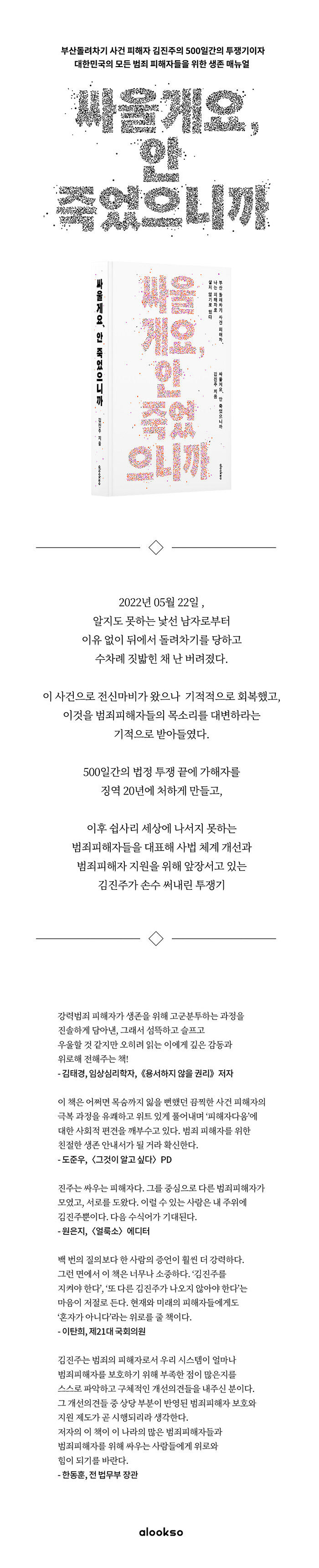 ºÎ»ê µ¹·ÁÂ÷±â »ç°Ç ÇÇÇØÀÚ ±èÁøÁÖÀÇ 500Àϰ£ÀÇ ÅõÀï±âÀÌÀÚ, ´ëÇѹα¹ÀÇ ¸ðµç ¹üÁËÇÇÇØÀÚµéÀ» À§ÇÑ »ýÁ¸ ¸Å´º¾ó. ÀÌ Ã¥Àº ¾ËÁöµµ ¸øÇÏ´Â ³¸¼± ³²ÀڷκÎÅÍ ÀÌÀ¯ ¾øÀÌ µÚ¿¡¼ µ¹·ÁÂ÷±â¸¦ ´çÇÏ°í ¼öÂ÷·Ê Áþ¹âÈù ä ¹ö·ÁÁ® Àü½Å¸¶ºñ°¡ ¿ÔÀ¸³ª ±âÀûÀûÀ¸·Î ȸº¹ÇØ 500Àϰ£ÀÇ ¹ýÁ¤ ÅõÀï ³¡¿¡ °¡ÇØÀÚ¸¦ ¡¿ª 20³â¿¡ óÇÏ°Ô ¸¸µé°í, ÀÌÈÄ ½±»ç¸® ¼¼»ó¿¡ ³ª¼Áö ¸øÇÏ´Â ¹üÁËÇÇÇØÀÚµéÀ» ´ëÇ¥ÇØ »ç¹ý ü°è °³¼±°ú ¹üÁËÇÇÇØÀÚ Áö¿øÀ» À§ÇØ ¾ÕÀå¼°í ÀÖ´Â ±èÁøÁÖ°¡ ¸öÀ¸·Î ¾´ ÅõÀï±â´Ù.