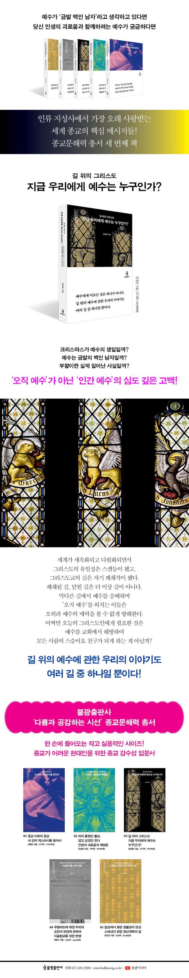 ¡ºÁö±Ý ¿ì¸®¿¡°Ô ¿¹¼ö´Â ´©±¸Àΰ¡?¡»´Â ¡®¹ÏÀ½¡¯ÀÌ ¾Æ´Ñ ¡®ÀÌÇØ¡¯ÀÇ Ãø¸é¿¡¼ Á¾±³¸¦ ¹Ù¶óº¸°í Á¾±³ °¨¼ö¼ºÀ» Ű¿ì´Â ¡®Á¾±³¹®ÇØ·Â ÃѼ¡¯ÀÇ ¼¼ ¹øÂ° Ã¥ÀÌ´Ù. ÀúÀÚ´Â ´©±¸º¸´Ù Àͼ÷ÇÑ À̸§ ¡®¿¹¼ö¡¯¿¡°Ô ¿©·¯ Áú¹®À» ´øÁø´Ù. ±×´Â °ú¿¬ ¿ì¸®°¡ ¾Æ´Â °Íó·³ ±Ý¹ßÀÇ ¹éÀÎ ³²¼ºÀϱî? ±×ÀÇ »ýÀÏÀº Å©¸®½º¸¶½º°¡ ¸ÂÀ»±î? Á¤¸» ±×´Â ºÎȰÇßÀ»±î? ÀúÀÚ´Â ¿©·¯ Áú¹®¿¡ °£°áÇÏ°í ¸íÈ®ÇÑ ¹®ÀåÀ¸·Î ¿ª»ç, ¹®È, ½Å¾Ó µî ¿©·¯ Ãø¸é¿¡¼ »çÀ¯ÇÏ°í ³»¸° ´äº¯µéÀ» ¼³µæ·Â ÀÖ°Ô Á¦½ÃÇÑ´Ù.