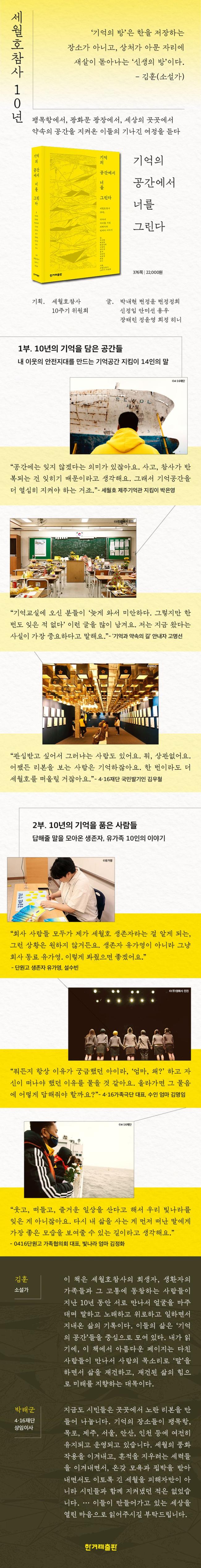¡¶±â¾ïÀÇ °ø°£¿¡¼ ³Ê¸¦ ±×¸°´Ù¡·´Â ¼¼¿ùÈ£Âü»ç 10³âÀÇ ½Ã°£À» Åë°úÇØ ¿Â ±â¾ï°ø°£µéÀ» Áß½ÉÀ¸·Î ¼¼¿ùÈ£ »ýÁ¸ÀÚ, À¯°¡Á·, Ȱµ¿°¡µéÀ» ÀÎÅͺäÇϰí, ¾ÈÀü»çȸ¸¦ À§ÇÑ ´ÙÀ½ °ÉÀ½À» °í¹ÎÇϴ åÀÌ´Ù. ¼¼¿ùÈ£Âü»ç¸¦ Áõ¾ðÇÏ´Â ¿©·¯ ±â·Ï¿¡¼ Àß ´Ù·ïÁöÁø ¾Ê¾ÒÀ¸³ª, ÇÇÇØÀÚ¿Í ¿¬´ëÀÚµéÀÇ ±¤ÀåÀÌÀÚ ÁýÀÌÀÚ ½°ÅÍ¿´´ø ¡®¼¼¿ùÈ£ ±â¾ï°ø°£¡¯À» ÀçÁ¶¸íÇÏ°í ±× Çʿ信 ÁÖ¸ñÇÑ´Ù´Â Á¡¿¡¼ Àǹ̰¡ ÀÖ´Ù.