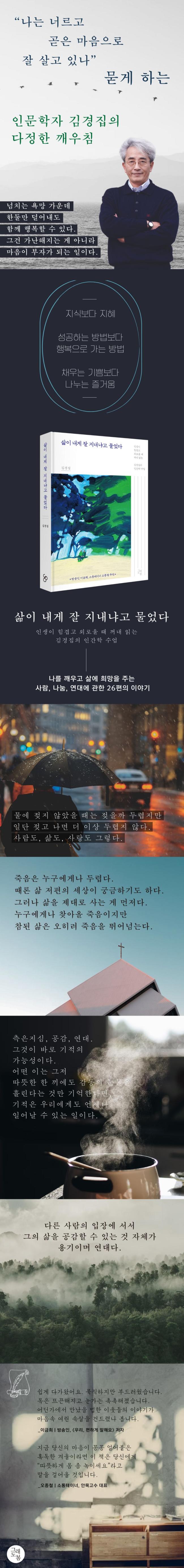 »çȸÀÇ À̸éÀ» ޱ¸ÇÏ¸ç »çÀ¯ÀÇ ÈûÀ» °Á¶Çؿ ½ÇõÀû Àι®ÇÐÀÚ ±è°æÁýÀÌ ½Å°£ ¡¶»îÀÌ ³»°Ô Àß Áö³»³Ä°í ¹°¾ú´Ù¡·¸¦ ÅëÇØ ¿ì¸®¿¡°Ô ¡®´ÙÁ¤ÇÑ ±ú¿ìħ¡¯ °Ç³Ù´Ù. »ç´Â °Ô È¥¶õ½º·´°í Èû°ãÁø ¾Ê³Ä°í, ¿Ü·Î¿ò¿¡ ÁöÄ¡Áø ¾Ê¾Ò´À³Ä°í, ÁÁÀº »ç¶÷°ú ¾Æ¸§´ä°Ô »ì°í´Â ÀÖ³Ä°í ¹¯´Â´Ù. ÁÖº¯À» µ¹¾Æº¸¸é ¿ä¸¸Á¶¸¸ÇÏ°Ô º¸ÀÏÁö ¸ô¶óµµ Å« ¿ï¸²À» ÁÖ´Â »ç¶÷°ú »îÀ» ¸¸³ª°Ô µÈ´Ù. ³ª¸¦ ÀÀ¿øÇØÁÖ°í ÁöÄѺÁÁÖ°í ÀÖ´Ù´Â ¿¬´ë°¨À» ´À³¢¸é ¹öÅß³¾ ÈûÀÌ »ý±ä´Ù°í ±í°í ³Ê¸¥ »ç¶ûÀÇ ¾ð¾î·Î ±ú¿ìÃÄÁØ´Ù.