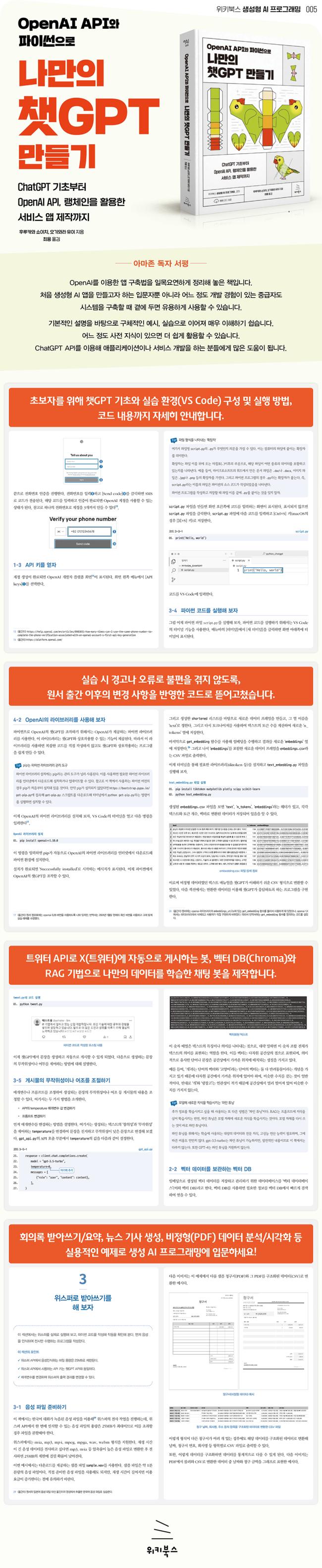 OpenAI API¸¦ Ȱ¿ëÇØ ÆÄÀ̽ãÀ¸·Î ÀΰøÁö´É ¾ÖÇø®ÄÉÀ̼ÇÀ» °³¹ßÇÏ´Â ¹æ¹ýÀ» ¾Ë·ÁÁØ´Ù. êGPT¿Í APIÀÇ ±âº» °³³äºÎÅÍ ÃֽŠÁ¤º¸¸¦ Ȱ¿ëÇÑ Ãªº¿, À½¼º Àνİú ¿ä¾à±îÁö ½ÇÀü ¿¹Á¦¸¦ ÅëÇØ OpenAI APIÀÇ ´Ù¾çÇÑ È°¿ë¹ýÀ» ÀÍÈú ¼ö ÀÖ´Ù. ¶ÇÇÑ ·©Ã¼ÀÎ(LangChain)°ú Å©·Î¸¶(Chroma) µîÀ» Ȱ¿ëÇÏ¿© ´ëÈÇü ¾ÖÇø®ÄÉÀÌ¼Ç °³¹ßÀ» È¿À²ÈÇÏ´Â ³ëÇϿ쵵 ¹è¿ï ¼ö ÀÖ´Ù.